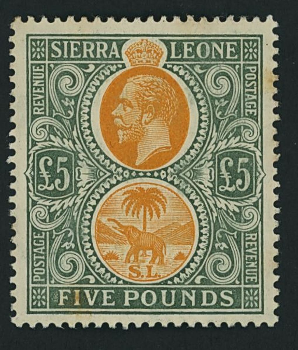 1912-21 MCA £5 orange and green, a few tone spots on reverse just showing through at foot, otherwise fine and very lightly mounted mint. S.G. 130, £4,500