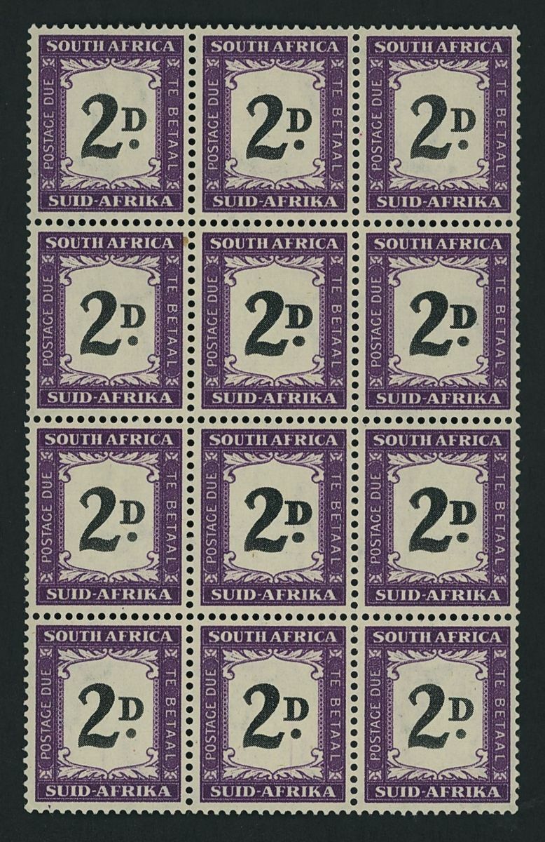1948-49 capital "D" 2d. black and violet block of twelve (3x4), Rows 15/5-6 and 16/5-6 variety thick double "D", fine unmounted mint. S.G. D36/a, £592