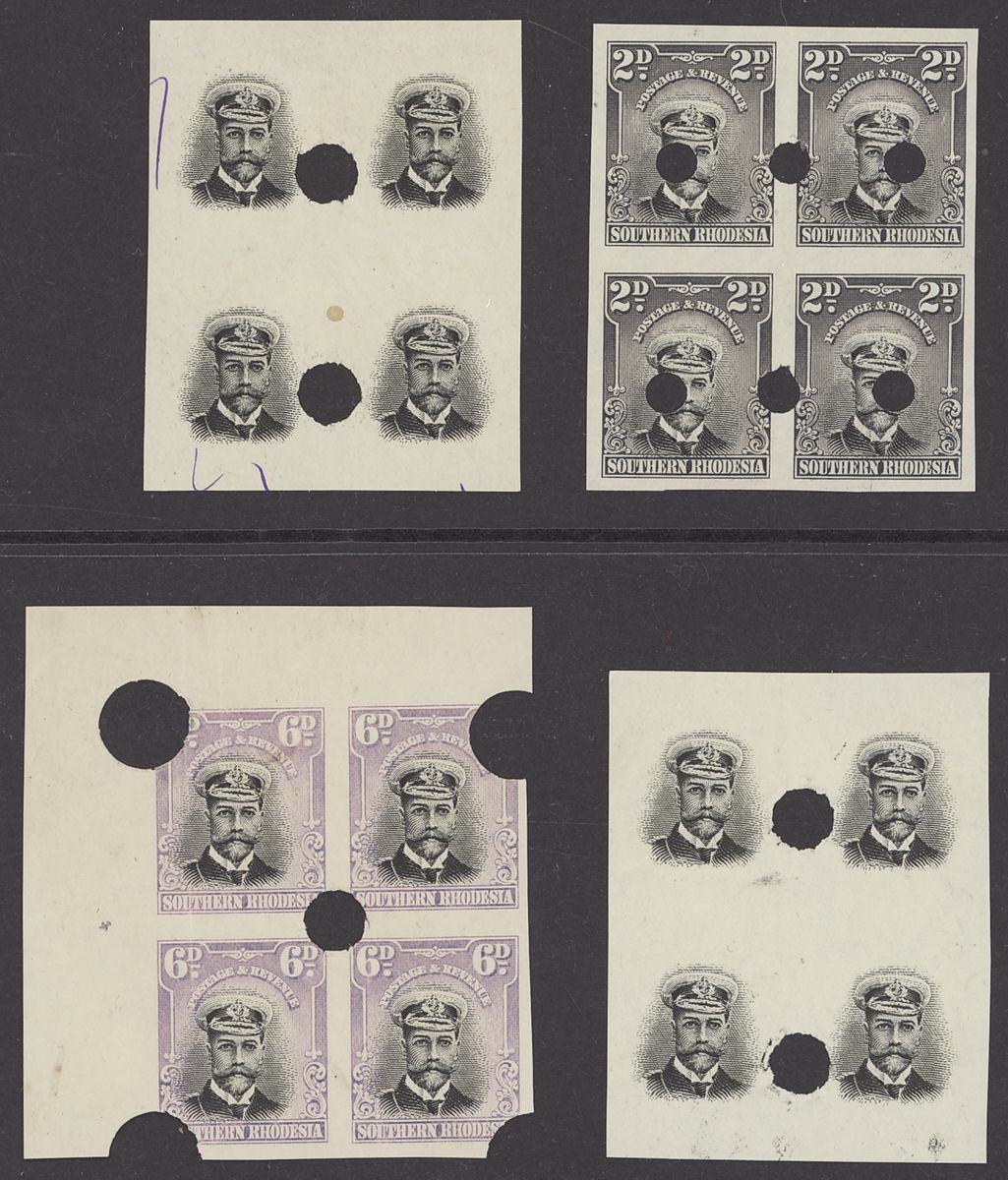 2d. 3rd. printing, 6d. 1st. printing and two heads only, all in imperforate blocks of four with various size punch holes