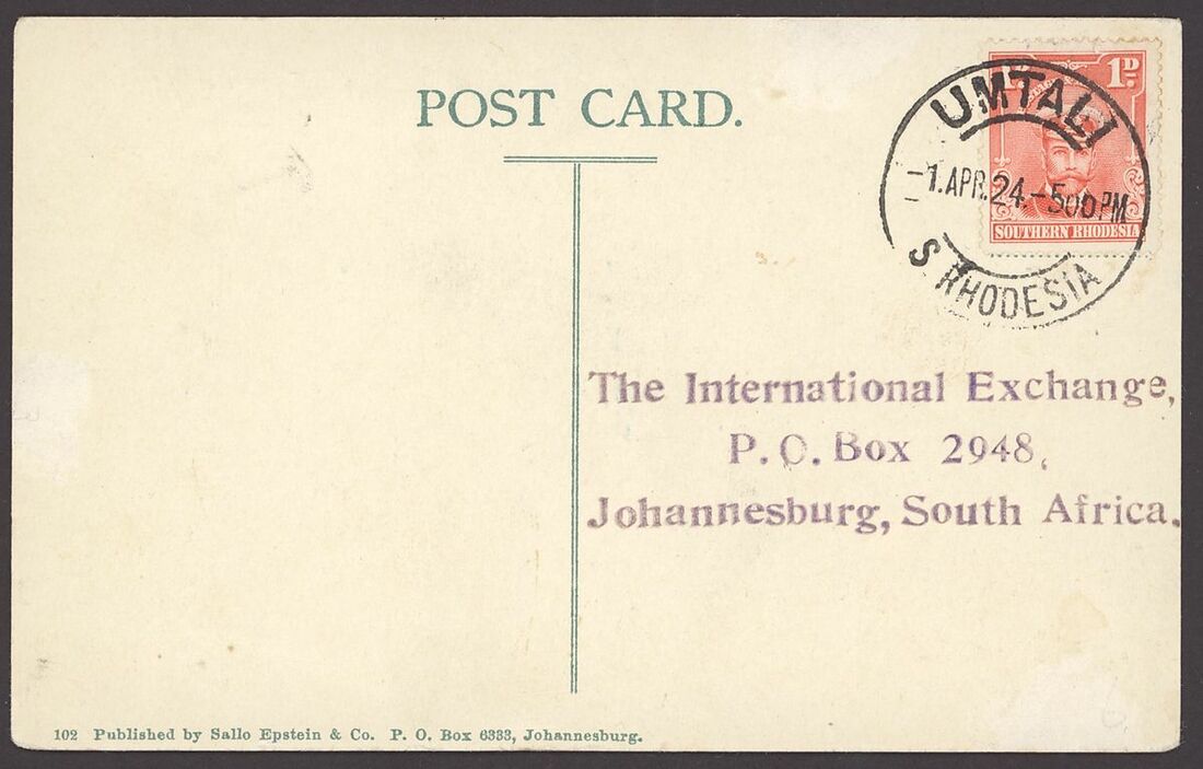 1924 (1 Apr.) postcard from Umtali to The International Exchange, Johannesburg, bearing 1d. bright rose neatly cancelled by 31mm. datestamp; a couple of white patches, otherwise fine