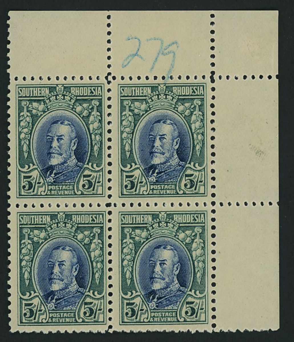5/- blue and blue-green upper right corner block of four with manuscript "279" above upper right-hand stamp, variety printed on the gummed side; very fine and an exceptional multiple of this very rare variety. One of three recorded. S.G. 27a, £34,000+