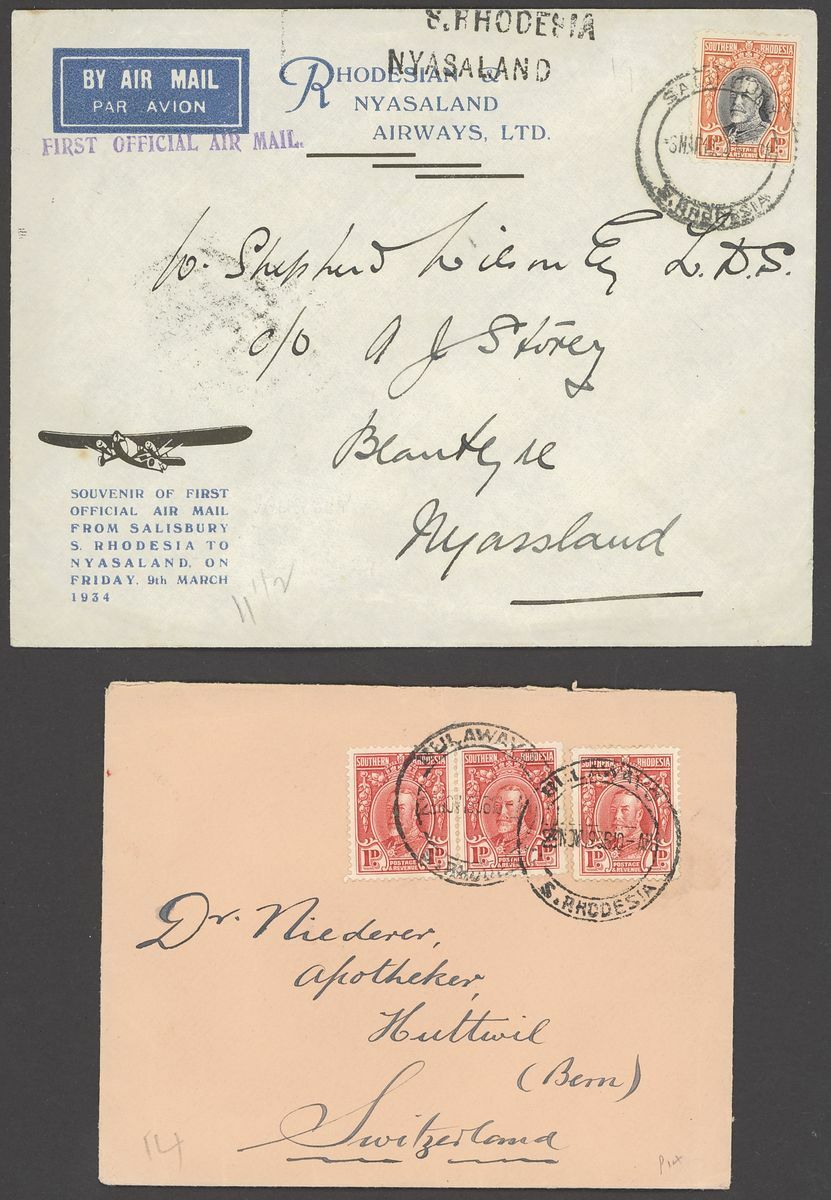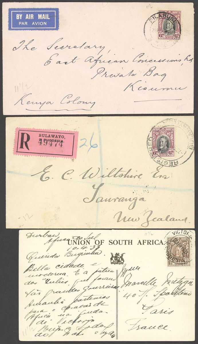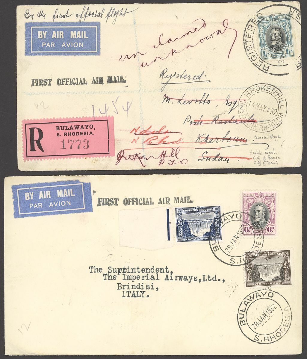 A group of covers and postcards (7, two sent registered) sent to various destinations across the globe including to France, Italy, New Zealand and Switzerland; three of which are First Official Air Mail envelopes, one sent to Khartoum, Sudan and re-directed to Broken Hill, Northern Rhodesia bearing 1/-; fine and some rare destinations