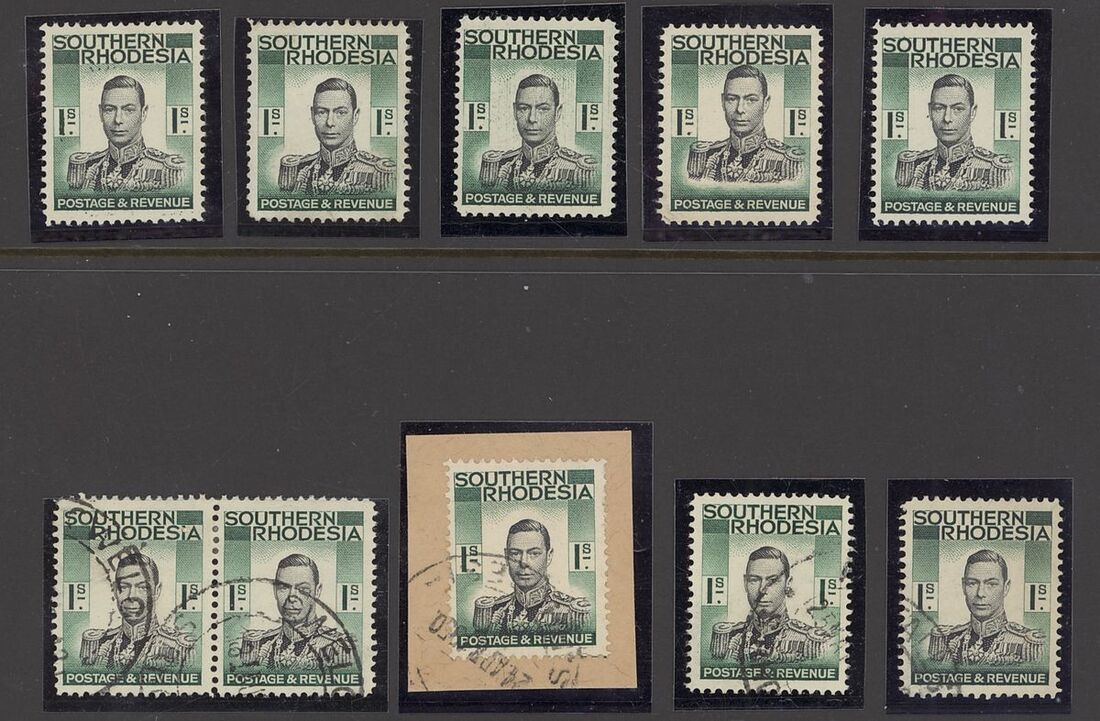 1937 1/- black and blue-green selection comprising mint (4, one with part gum and two unmounted) one showing green ink smudge, and used (4 with a pair and two singles, one on piece) showing varying degrees of vignette misplacement, and a mint single with black spot to left of King's right ear; also a used normal