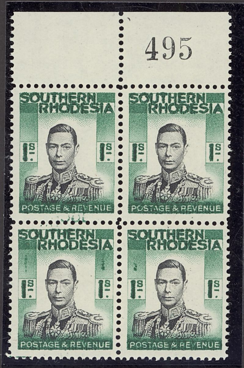 1937 1/- black and blue-green marginal block of four, [9-20] with sheet number "495" and printer's guide mark below [19], variety frame double, one albino and with additional partial "