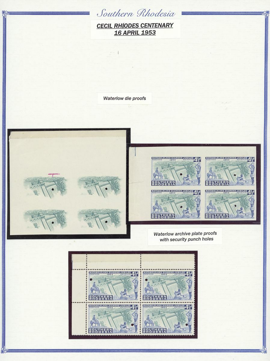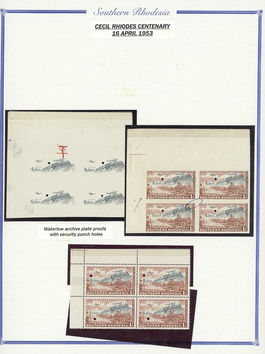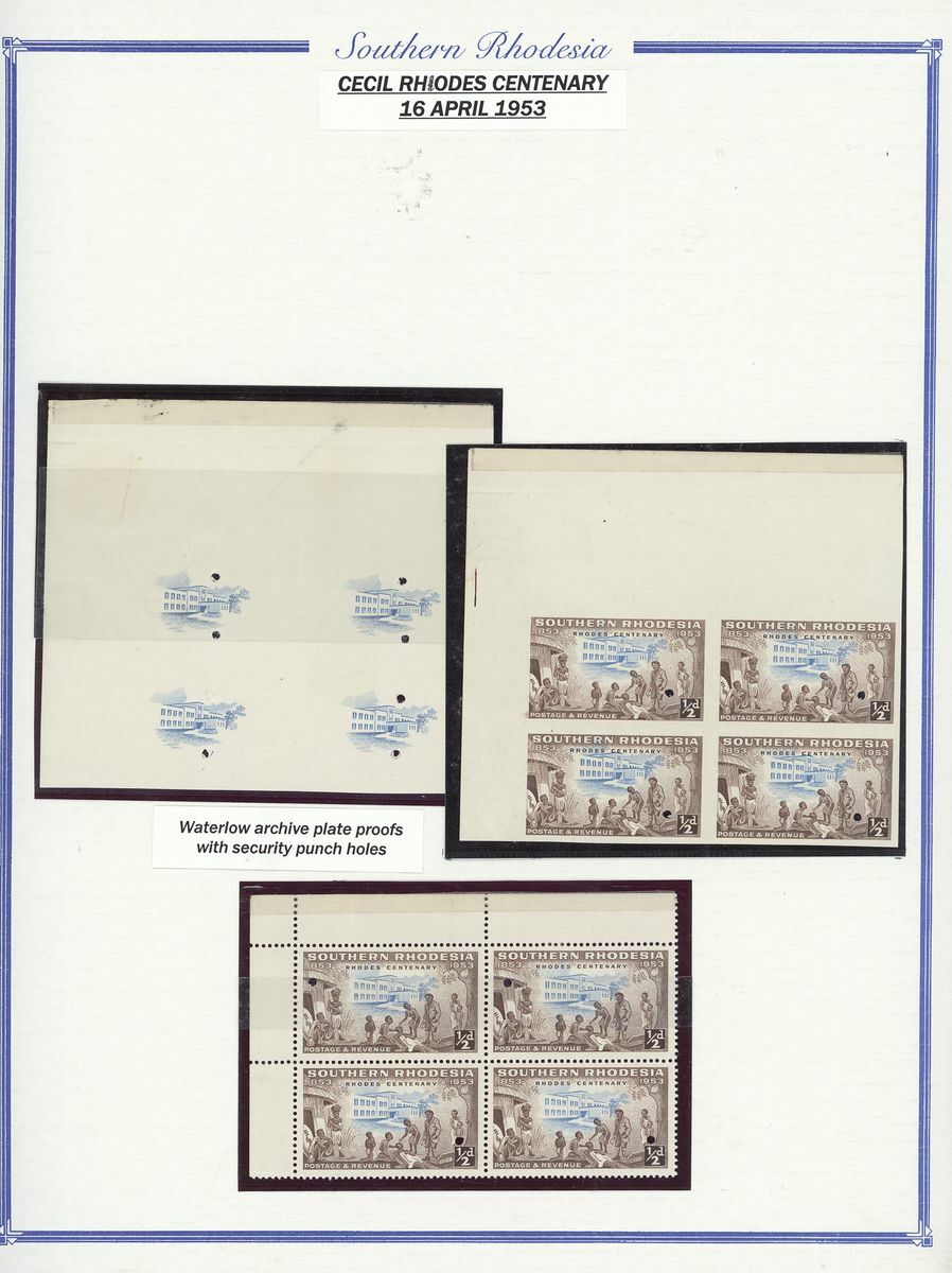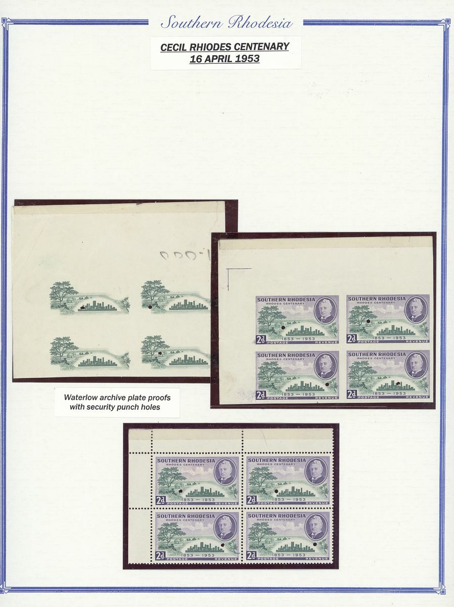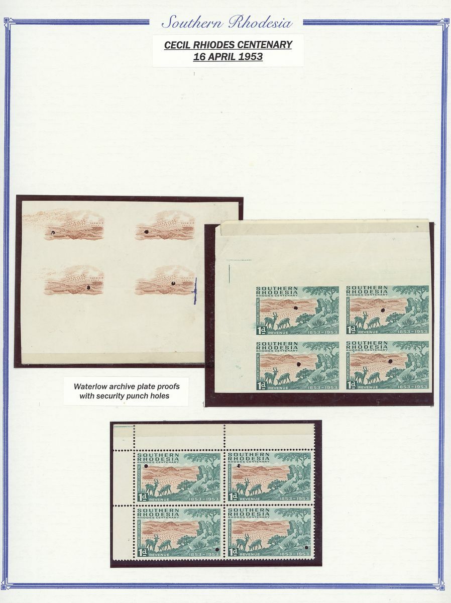 1953 (Apr.) Cecil Rhodes imperforate printer's plate proofs comprising vignette and complete design (2, one perforated) in corner blocks of four with three having small printer's correction marks, all with a small punch hole, and offered with the issued stamps in blocks of four from the four corners of the sheet, imprint blocks of four and singles