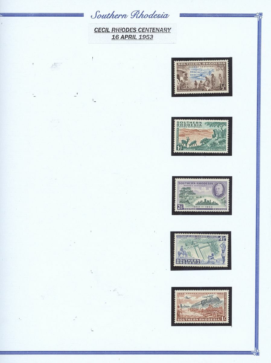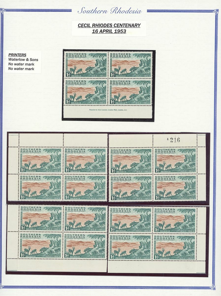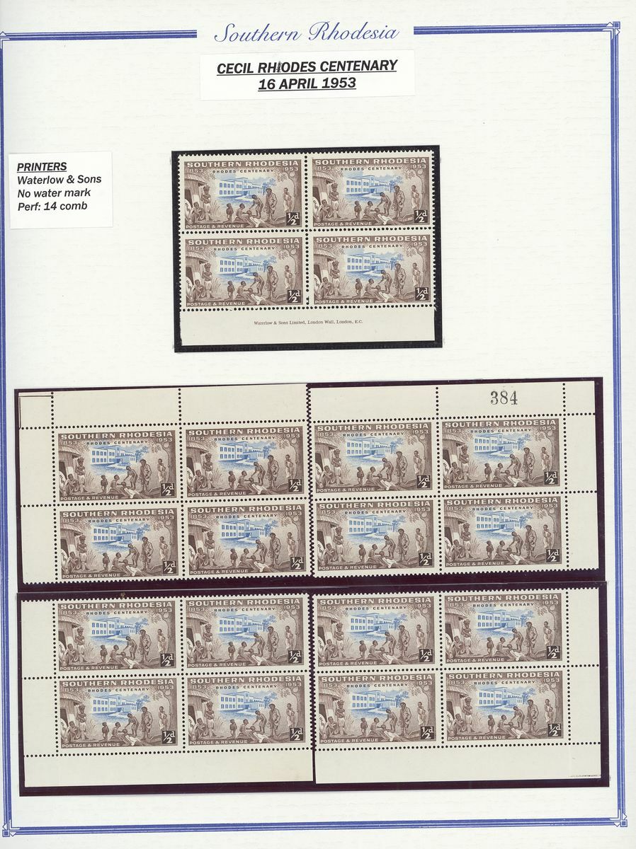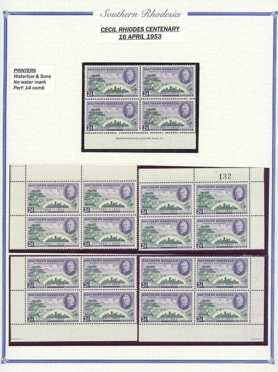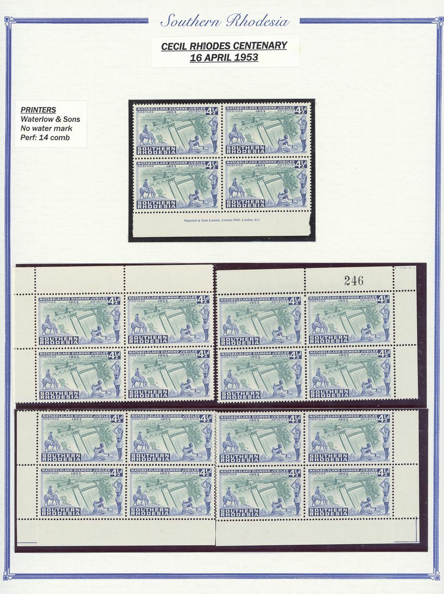 1953 (Apr.) Cecil Rhodes imperforate printer's plate proofs comprising vignette and complete design (2, one perforated) in corner blocks of four with three having small printer's correction marks, all with a small punch hole, and offered with the issued stamps in blocks of four from the four corners of the sheet, imprint blocks of four and singles