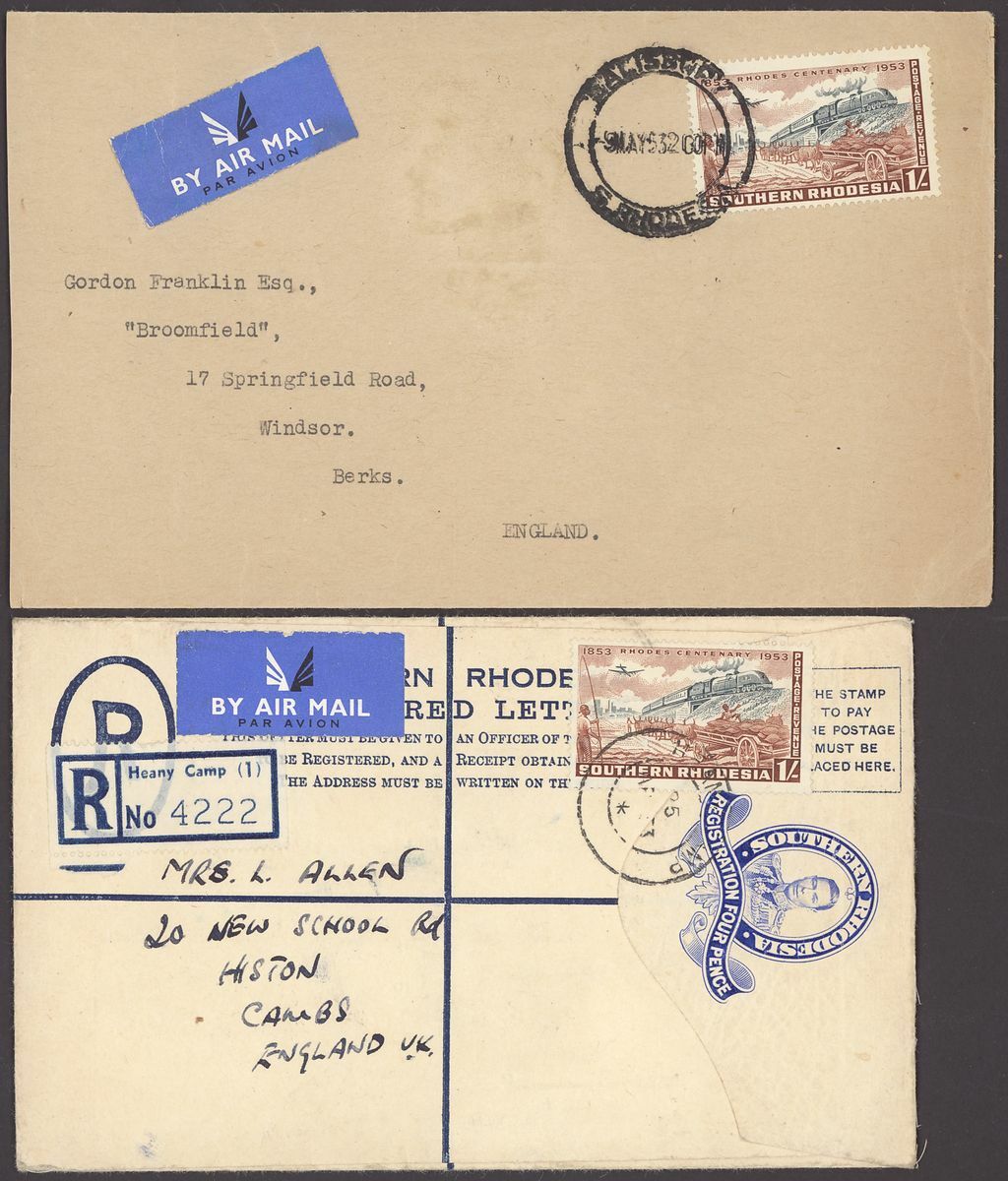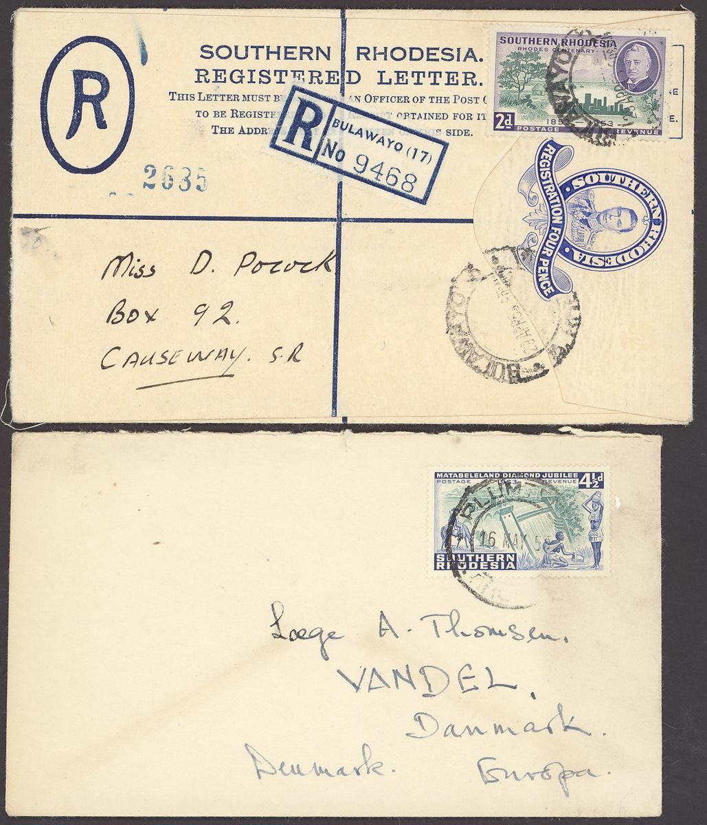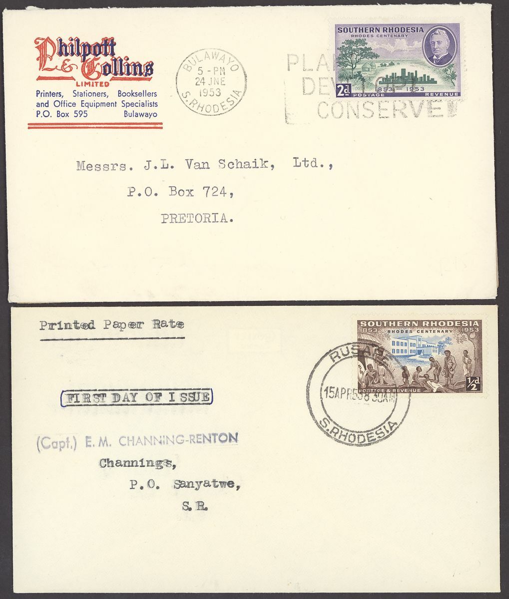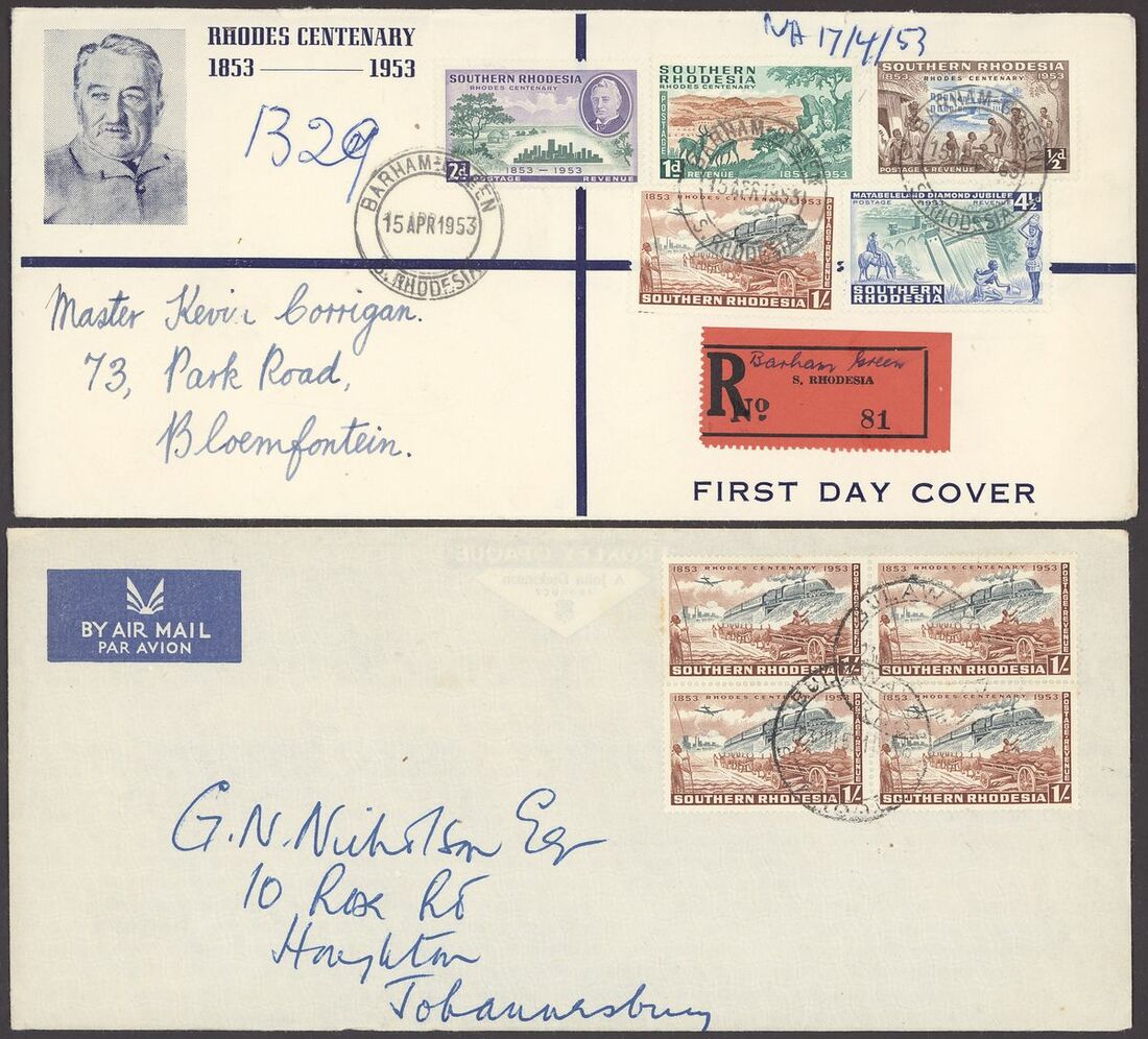 1953 (Apr.) Cecil Rhodes, a collection (21) with two sets on first day covers, one registered from Bulawayo addressed locally and one registered from Barnham Green to Bloemfontein with manuscript registration label, others addressed within Africa or to Denmark, England, Sweden or U.S.A. with a variety of frankings, four on 4d. registered envelopes and one bearing ½d. only from Rusape to Sayyatwe at the printed paper rate. An interesting lot
