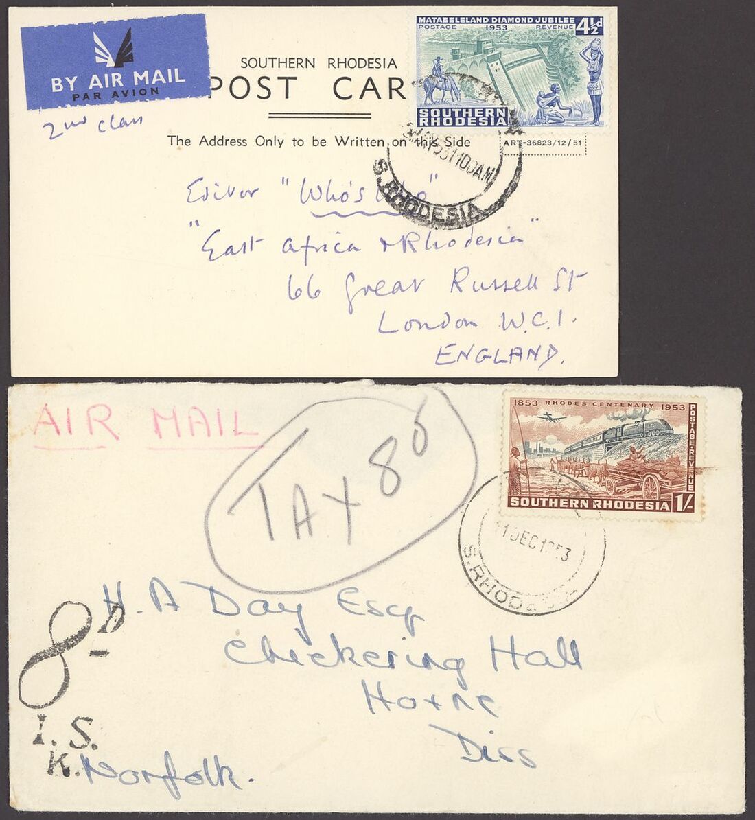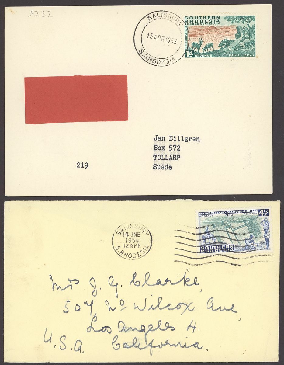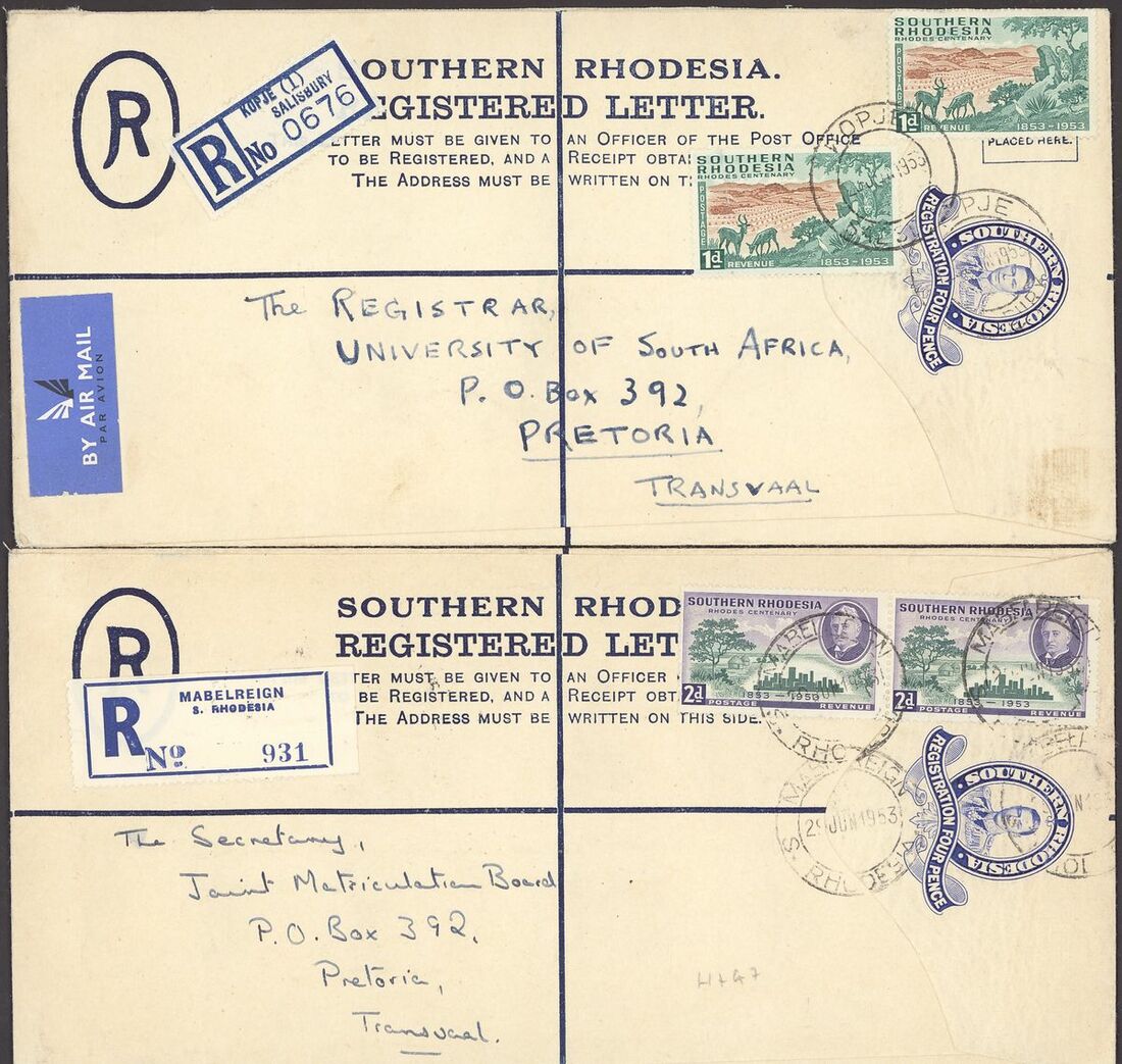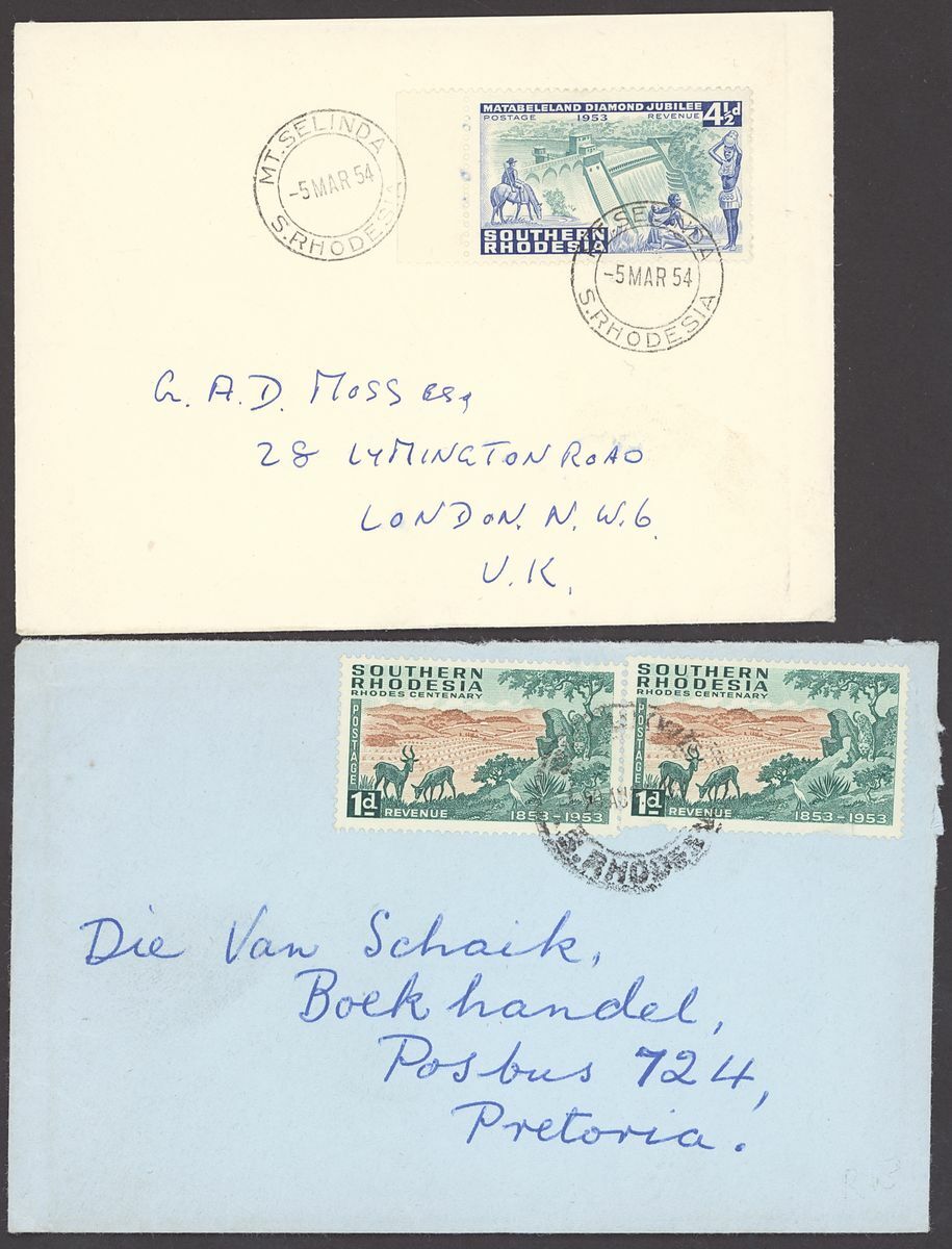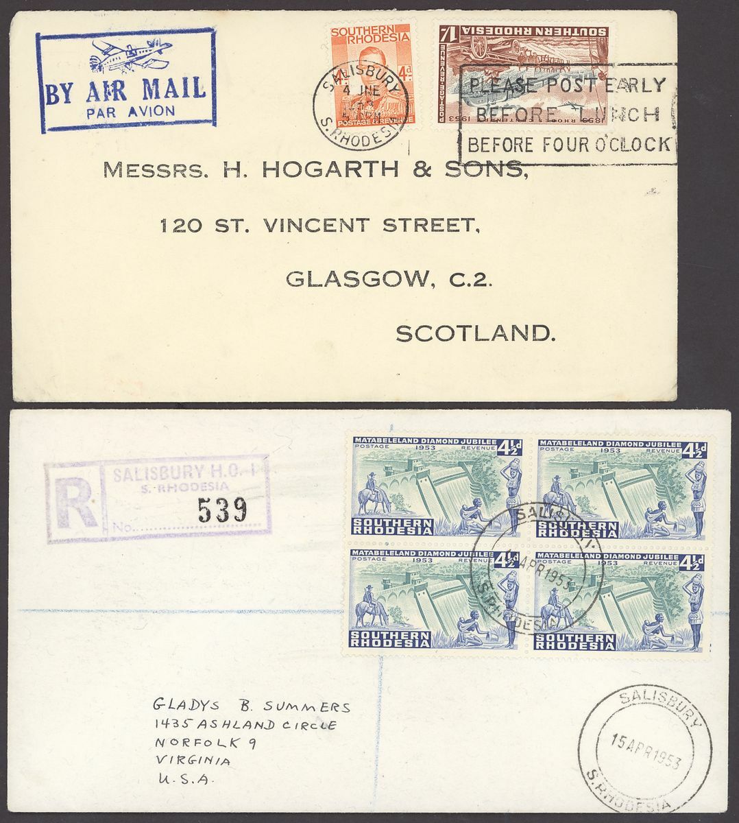 1953 (Apr.) Cecil Rhodes, a collection (21) with two sets on first day covers, one registered from Bulawayo addressed locally and one registered from Barnham Green to Bloemfontein with manuscript registration label, others addressed within Africa or to Denmark, England, Sweden or U.S.A. with a variety of frankings, four on 4d. registered envelopes and one bearing ½d. only from Rusape to Sayyatwe at the printed paper rate. An interesting lot