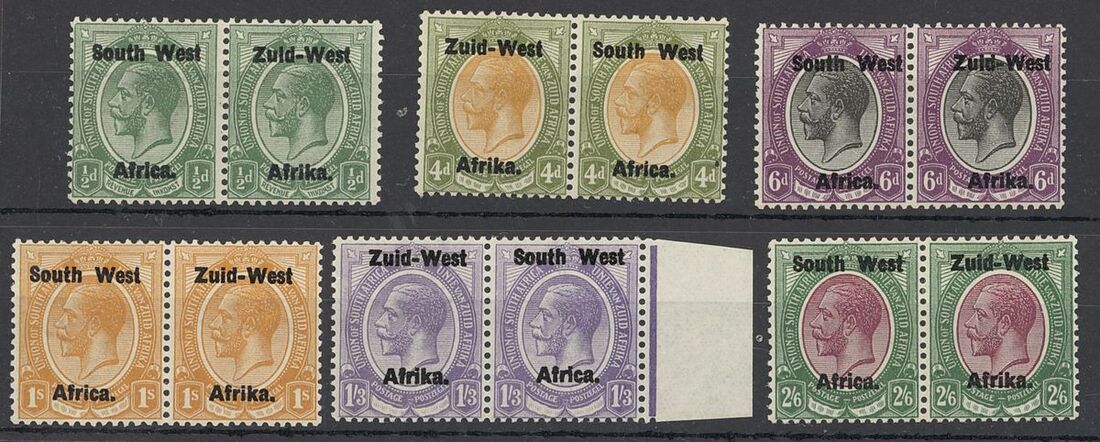 1923 (Jan.-June) Setting I, ½d., 4d., 6d., 1/-, 1/3d. and 2/6d. horizontal pairs with litho overprints in shiny ink, lightly mounted mint. S.G. 1d., 5a, 6a, 7a, 8a, 9a, £398