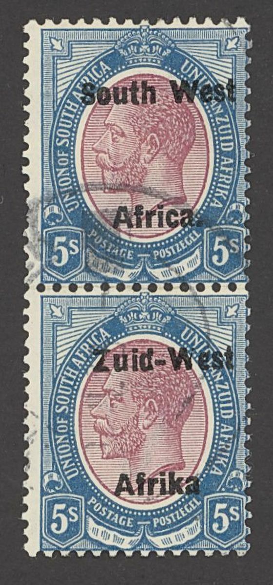 1923 (31 Mar.) Setting II 5/- purple and blue vertical pair, the lower stamp variety no stop after "Afrika", mainly lightly cancelled with Windhoek datestamp. R.P.S. Certificate 111,469, not now present. S.G. 13a, £270