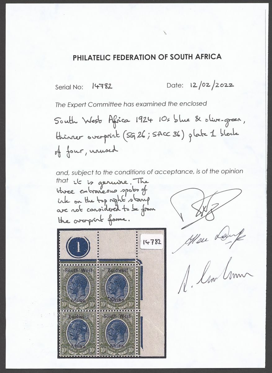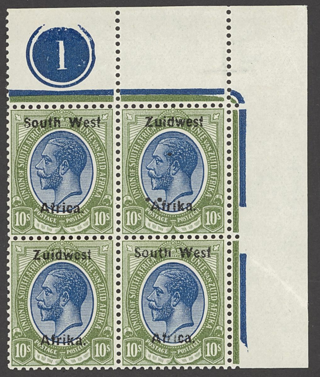 1923 (15 July) - 1926 Setting III 10/- blue and olive-green plate number '1' upper right corner block of four unmounted mint original gum, the upper right stamp showing three extra black dots believed not to be part of the overprint process, Philatelic Federation of South Africa certificate (2022). S.G. 26, SACC 36