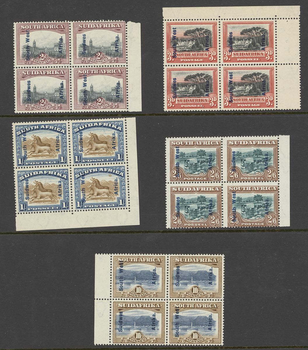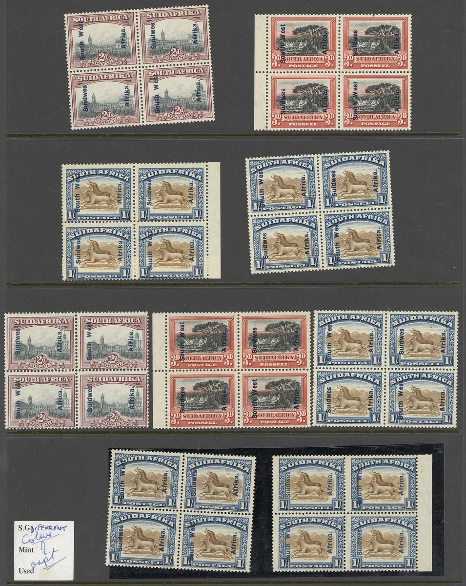 1927-30 Pictorial 2d. (3), 3d. (3), 1/- (6), 2/6d. and 10/- blocks of four, several marginal or from the corners of the sheet, mint with some unmounted
