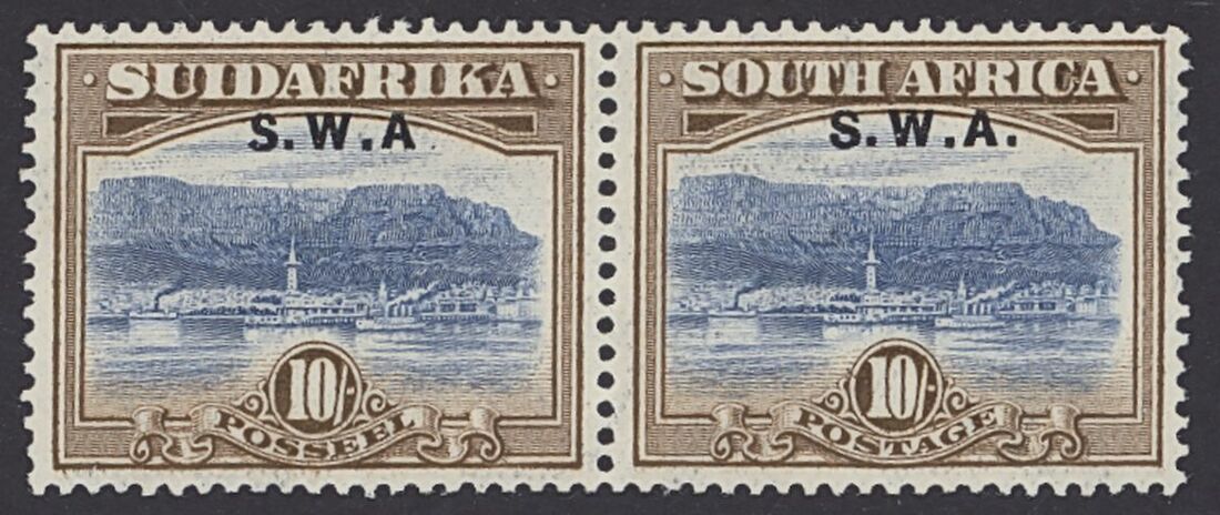 1927-30 Pictorial 10/- bright blue and brown perf. 14x13½ horizontal pair, variety without stop after "A", large part original gum. Fine S.G. 67a, £375.