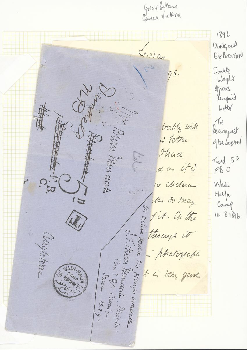1896 Dongola Expedition double rate officers unstamped longsize envelope to Sevenoaks and redirected to Dunkeld, marked "On Active Service. No stamps available. J.F. Burn Murdoch, Mialai, Com. E. Cavalry. Sarra 13.8.96", showing Wadi Halfa Camp c.d.s. (14.8), boxed "T" and London "