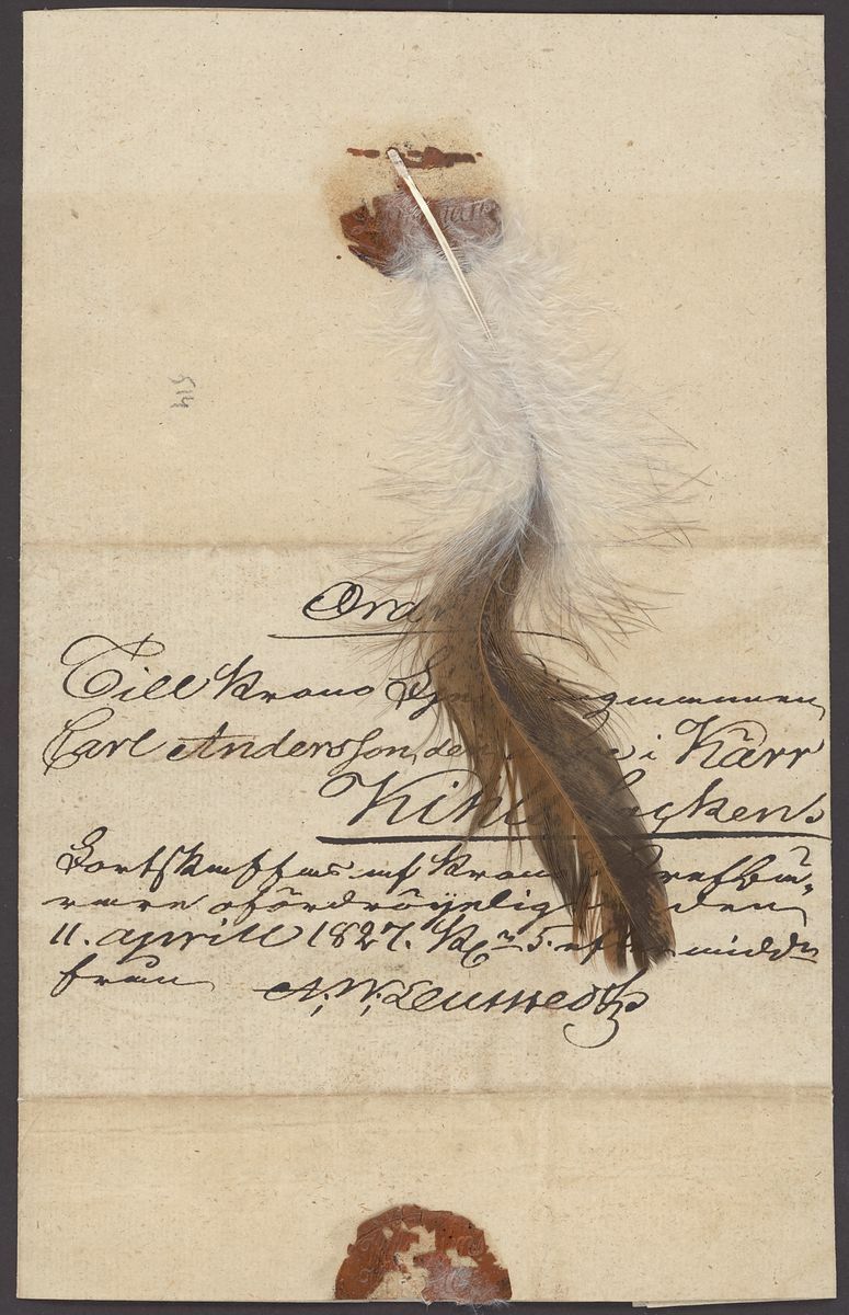 1827 entire feather letter to Karr(?) headed "Ordres" with white and black feather affixed by wax seal to reverse indicating that the letter must travel to its destination by night and day. Fine and unusual.