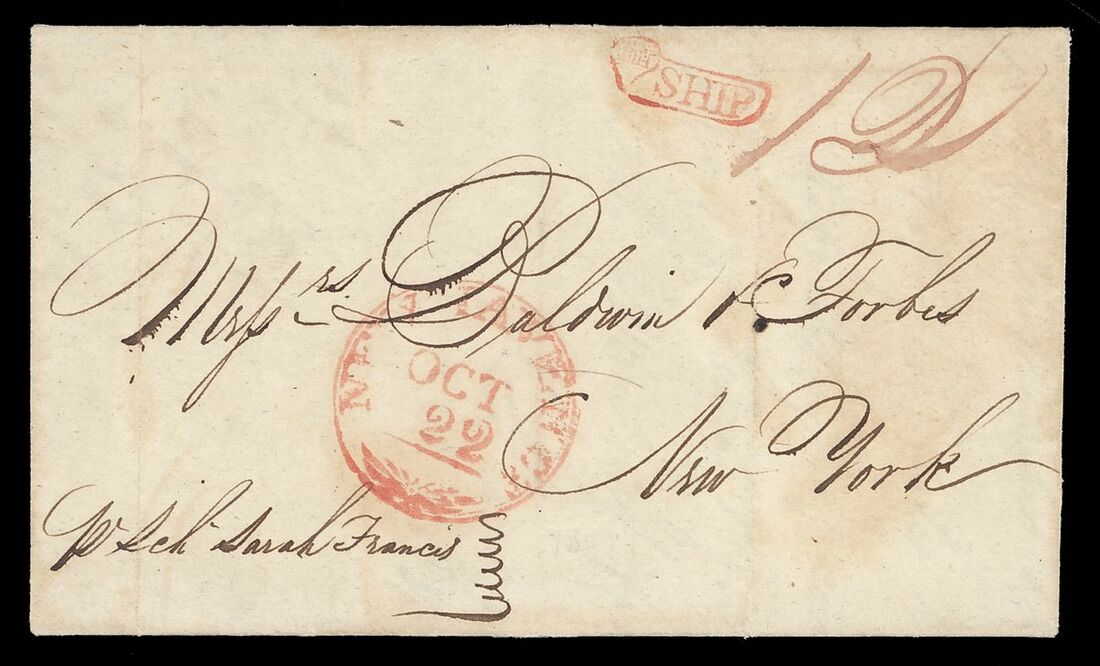 1827 (4 Oct.) entire letter to New York, "Pr. Sch Sarah Francis", headed "St. Barts" (St. Barthelemy, an Island in the West Indies purchased by Sweden in 1784 and now part of the United States Virgin Islands), with red framed "