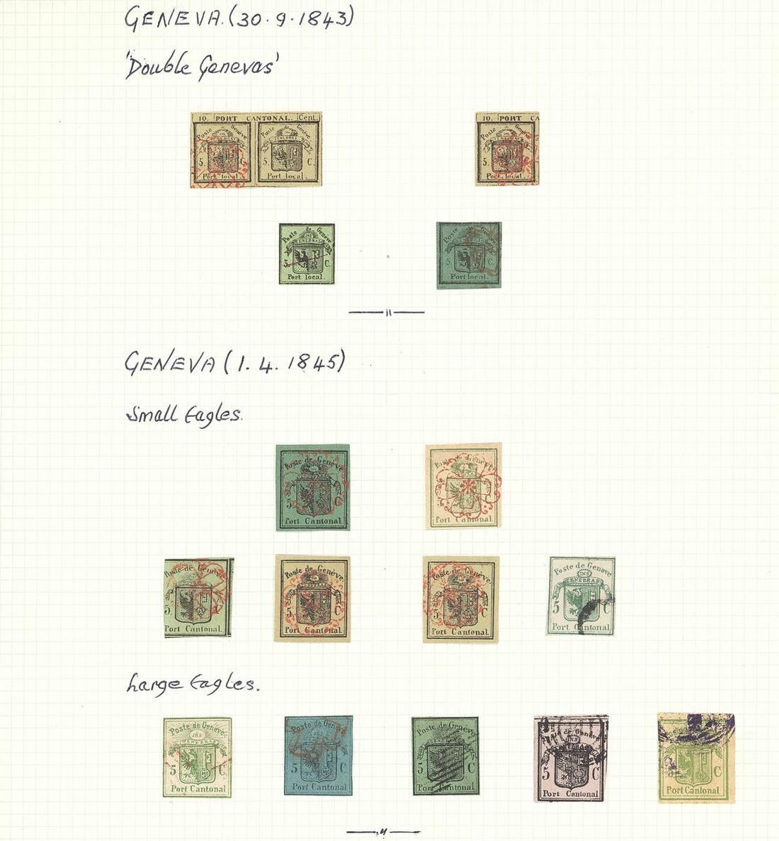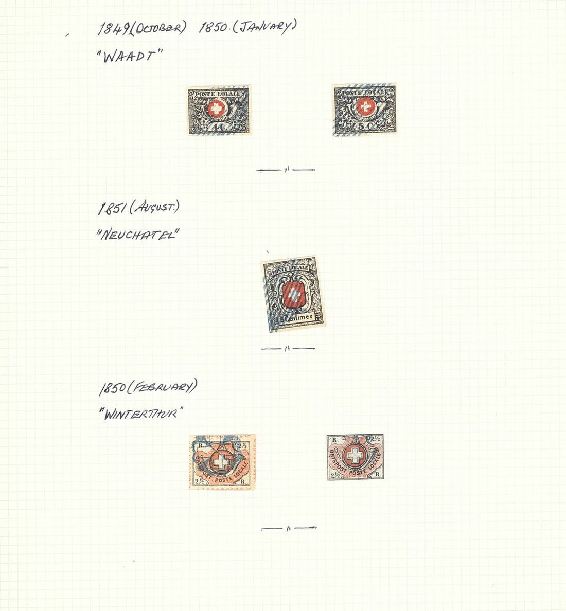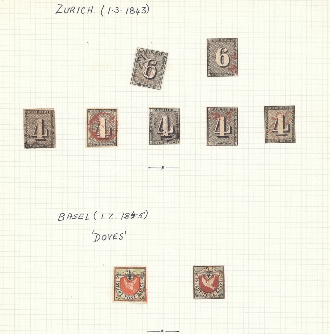 1843-50 forgeries selection (37) arranged on four album pages including, Basel, Zurich, Geneva, Waadt, Neuchatel, Winterthur and Rayons, from poor to well executed, mixed condition, an interesting group .