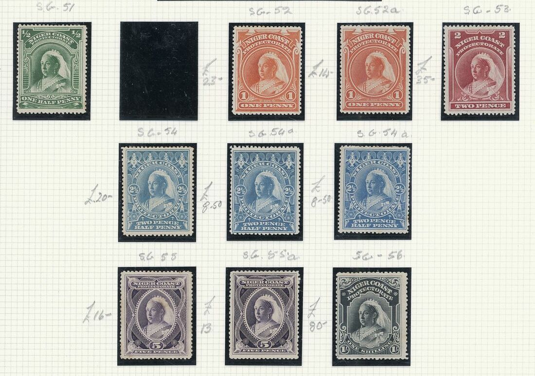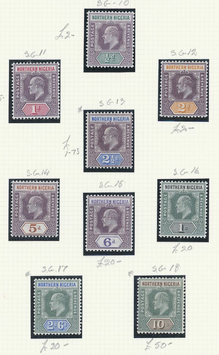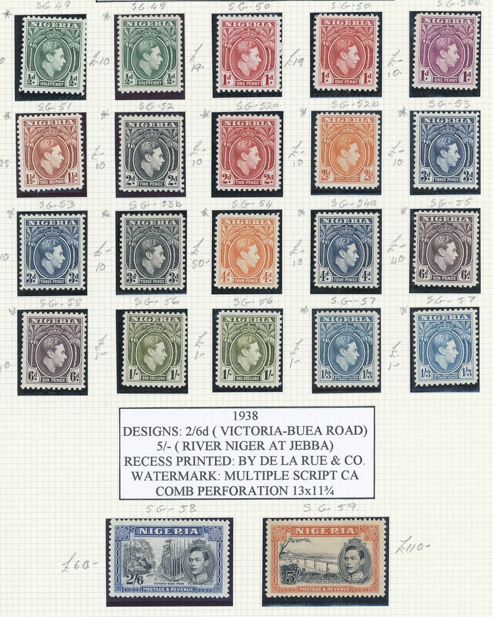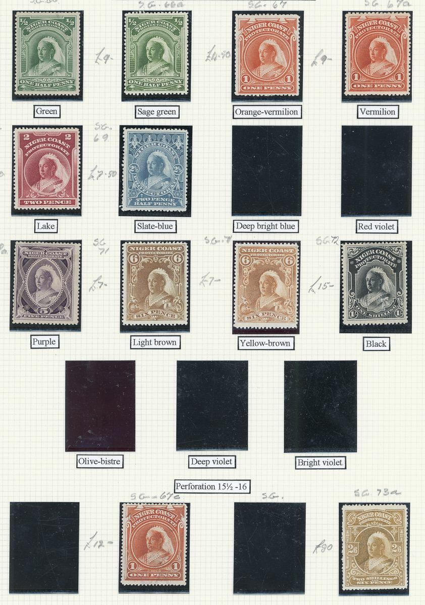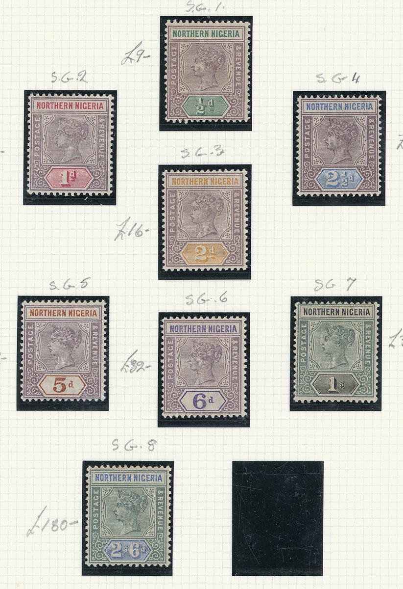 A mint West Africa collection on album pages including Gold Coast with 1884-91 set to 2/-, 1898-1902 set to 5/-, 1902 set to 20/-, 1904-06 set to 2/6d., 1907-13 set to 5/-, 1938-44 set to 5/-, Lagos with 1887-1902 part set to 5/-, 1904-06 set to 10/-, Niger Coast Oil Rivers 1892-94 set to 1/-, Niger Coast sets with values to 10/-, Northern Nigeria with 1900 part set to 2/6d., 1902 set to 10/-, 1905-07 part set to 2/6d., 1910-11 set to 10/-, Southern Nigeria with 1901 and 1903 sets to 10/-, 1904-09 part set to 5/-, 1907-11 set to 10/-, Nigeria 1938-47 set to 5/-, etc.,