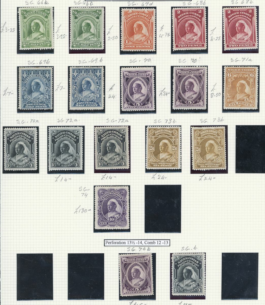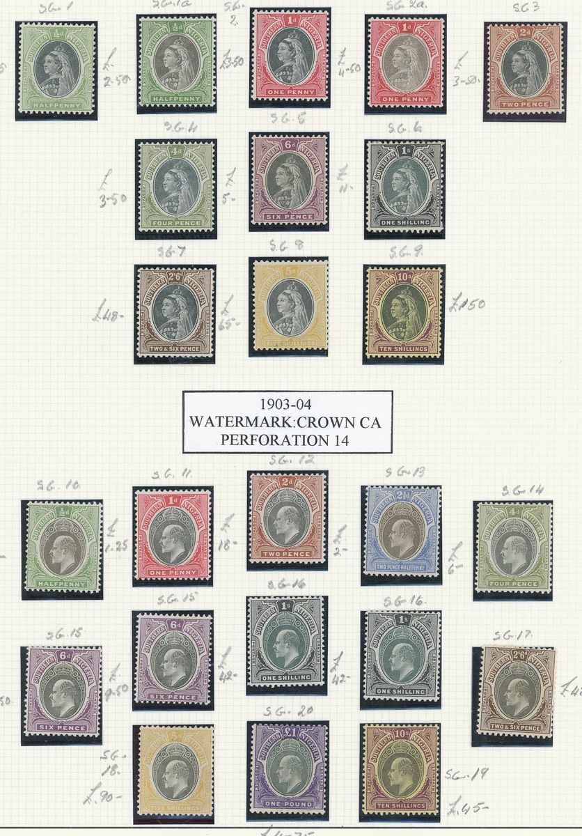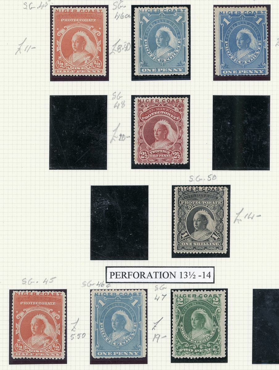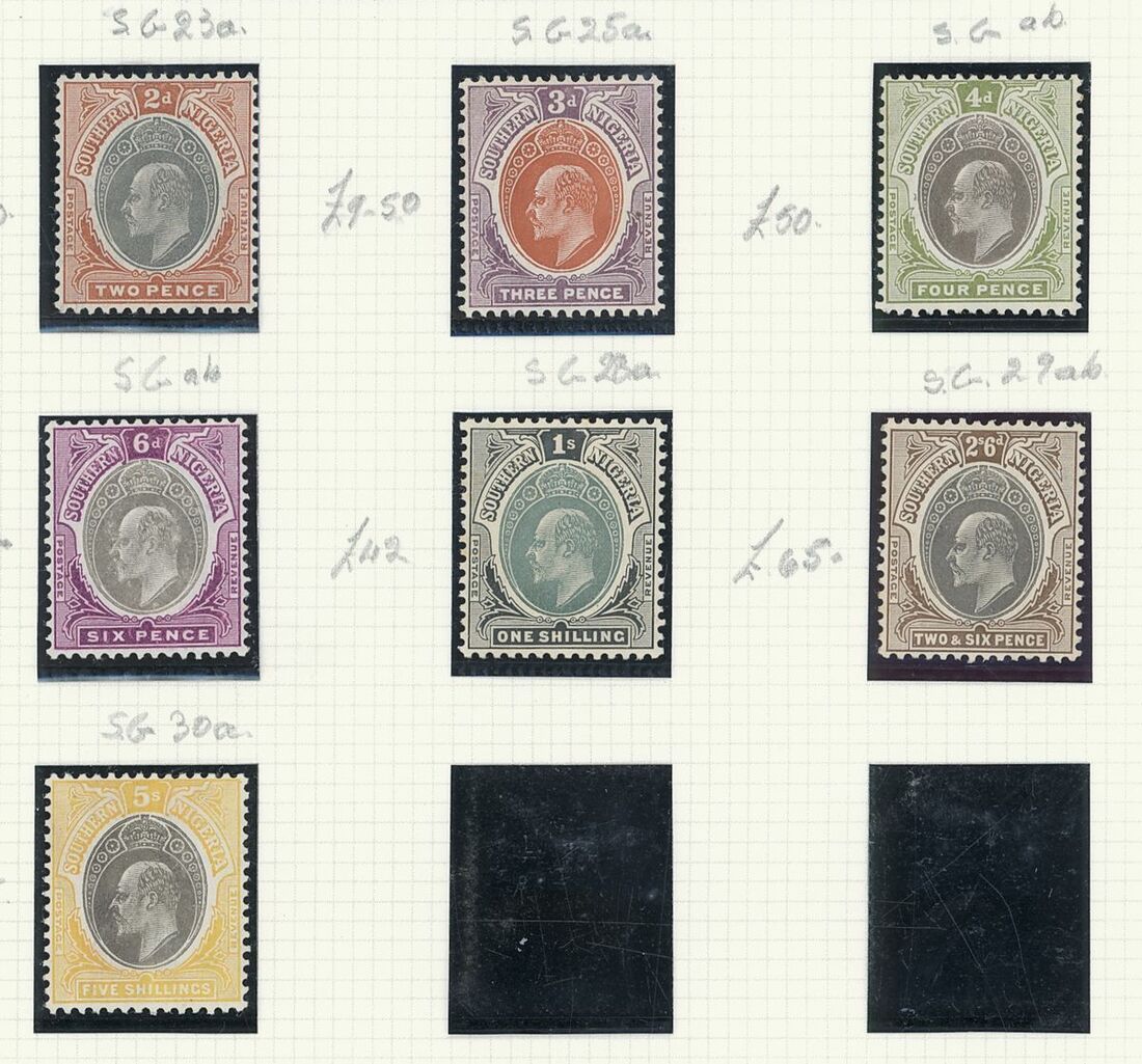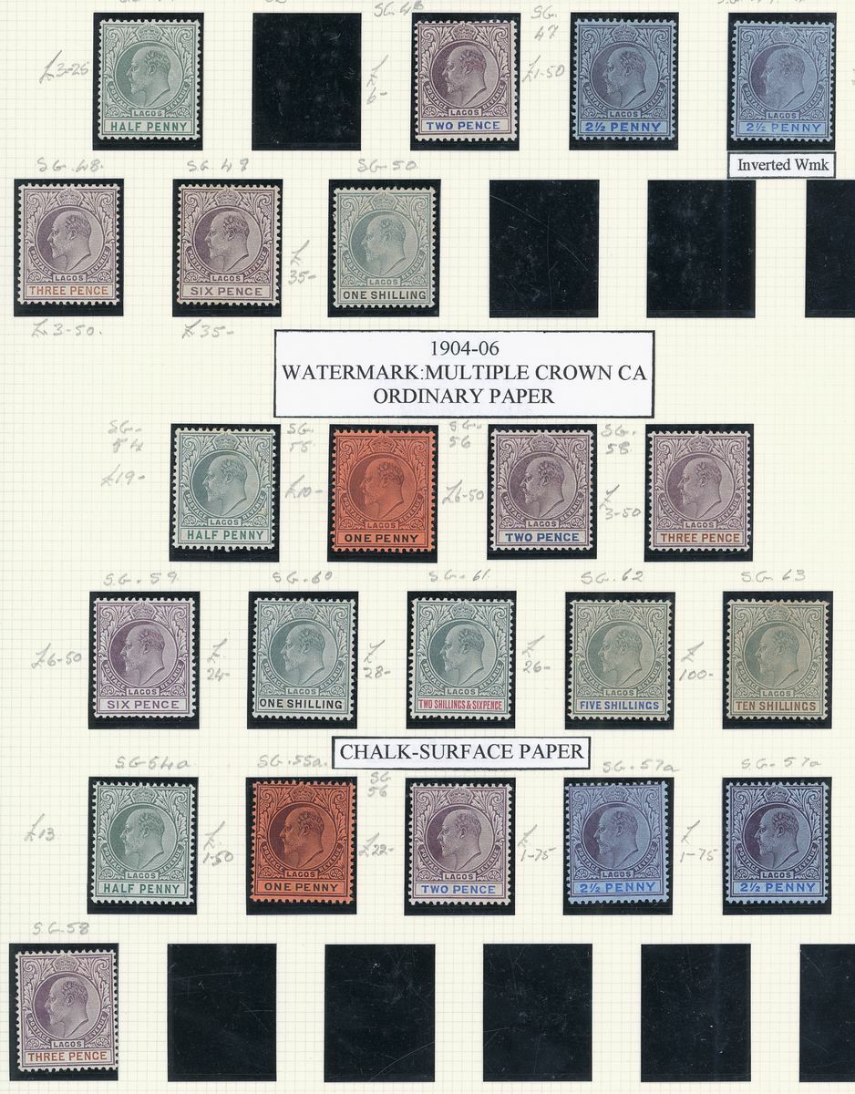 A mint West Africa collection on album pages including Gold Coast with 1884-91 set to 2/-, 1898-1902 set to 5/-, 1902 set to 20/-, 1904-06 set to 2/6d., 1907-13 set to 5/-, 1938-44 set to 5/-, Lagos with 1887-1902 part set to 5/-, 1904-06 set to 10/-, Niger Coast Oil Rivers 1892-94 set to 1/-, Niger Coast sets with values to 10/-, Northern Nigeria with 1900 part set to 2/6d., 1902 set to 10/-, 1905-07 part set to 2/6d., 1910-11 set to 10/-, Southern Nigeria with 1901 and 1903 sets to 10/-, 1904-09 part set to 5/-, 1907-11 set to 10/-, Nigeria 1938-47 set to 5/-, etc.,