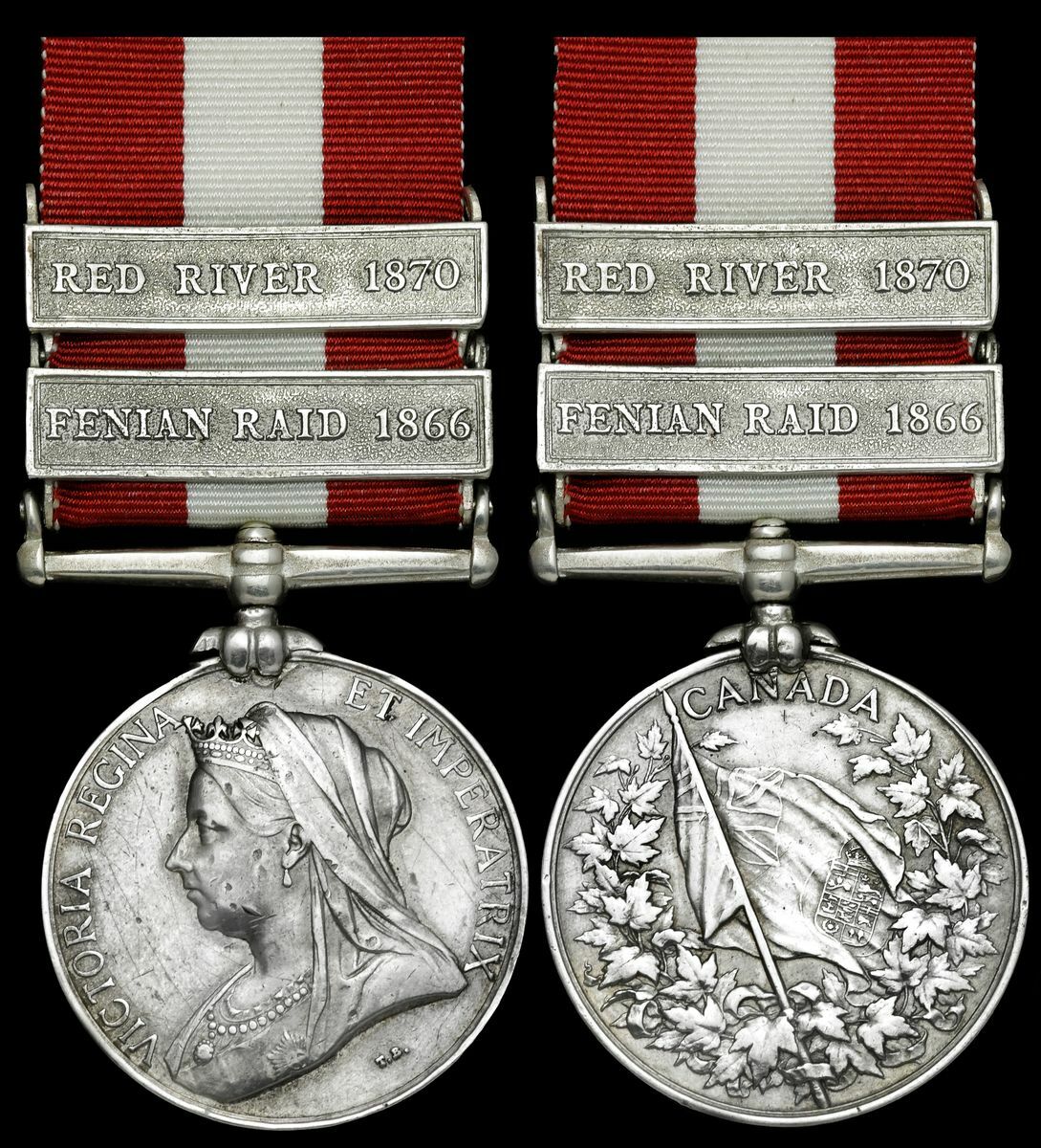 (x) Canada General Service 1866-70, 2 clasps, Fenian Raid 1866, Red River 1870 (Gr. H. Davis. G.T. R.A.), the second clasp a tailor's copy, claw loose, thus fine