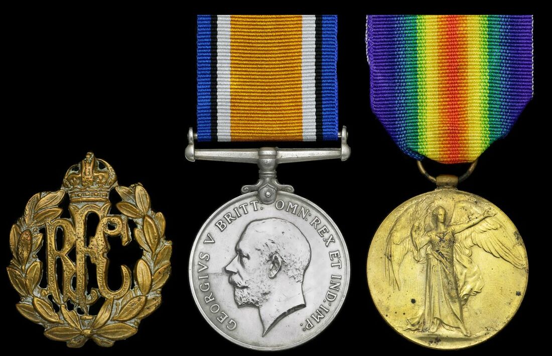Walter Rhymes was born in 1879 and was married in 1910 in Lewes, Sussex. Enlisting with the Royal Flying Corps on 11 September 1916 as Air Mechanic Class II, the Royal Air Force Muster role denotes his original trade as Cook however on the formation of the R.A.F. he -was re-classified as Private Class I, serving with 2 B Wing. Rhymes was discharged on 30 April 1920; sold together with a copied map of Seaford, East Sussex and several postcards of the town as well as an original R.F.C. cap badge.