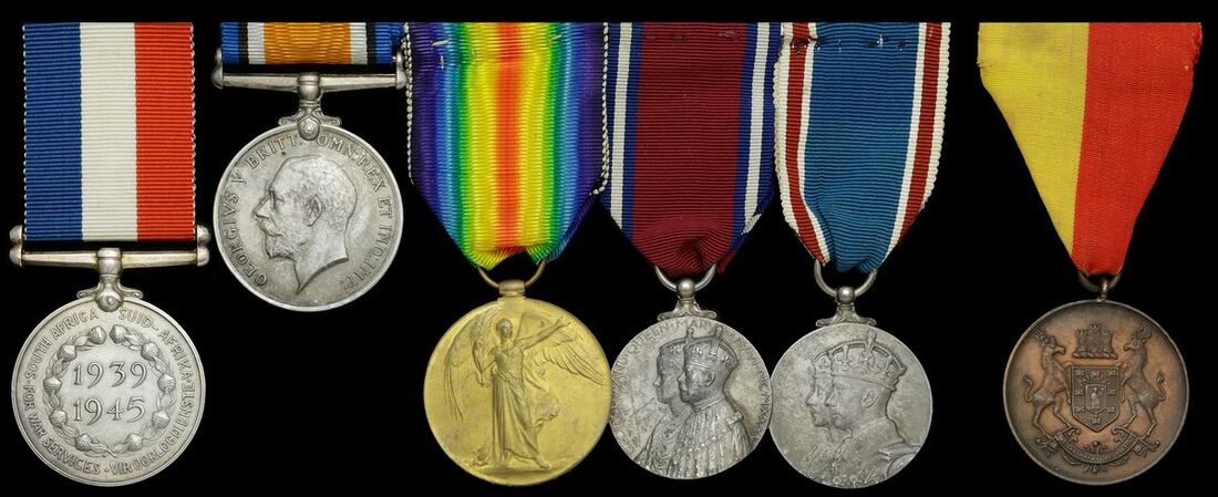 British War and bi-lingual Victory Medals (Pte J. F. Plain. D.S.C.); South African Medal for War Service 1939-45; Jubilee 1935; Coronation 1937, good very fine, together with a Pretoria Citizen's Service Medal 1914-1919 and two Masonic medals (8)