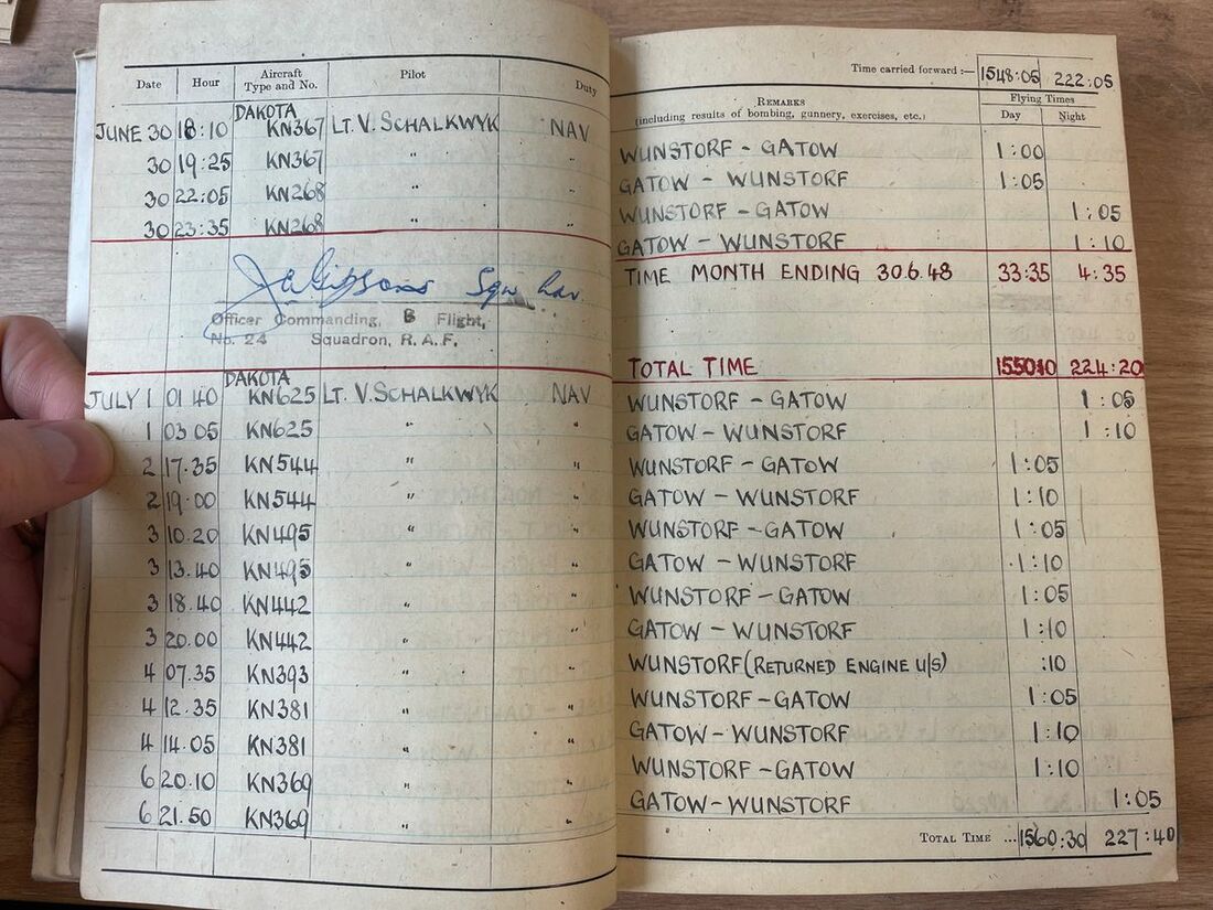 Returning to No. 24 Squadron in the U.K. in February 1948, his Log Books confirm his being 'Detached for Operation "Carter-Paterson"' in what would see the start of the Berlin Airlift.
