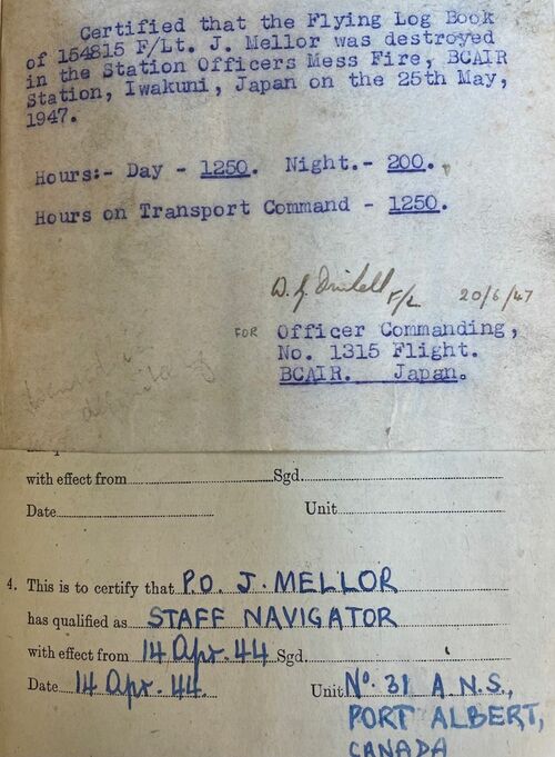 Jack Mellor enlisted in the Royal Air Force in mid-1943 and trained as a Navigator out in Canada, qualifying in April 1944. Returning to the U.K. at the end of the latter year, he was posted to No. 48 Squadron, a Dakota unit of Transport Command operating out of Down Ampney, in January 1945, and undertook numerous supply and ferrying missions over North West Europe until V.E. Day, the evacuation of casualties being high on the Squadron’s agenda. His next posting was to No. 24 Squadron, a York unit operating out of Hendon, between June and October 1946, an appointment that saw him involved in flying high-ranking R.A.F. Officers around the world, and ultimately being sent to Japan as a member of aircrew for Lieutenant-General Gairdner and Lieutenant-General Robertson, C.-in-C., B.C.O.F.