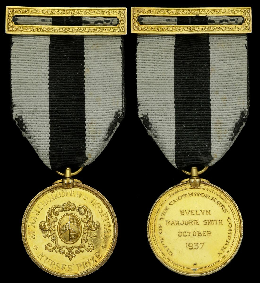 St Bartholomews Hospital, gilt metal Nurses Prize Medal, the reverse engraved 'City of the Clothworkers' Company Evelyn Marjorie Smith October 1937', very fine