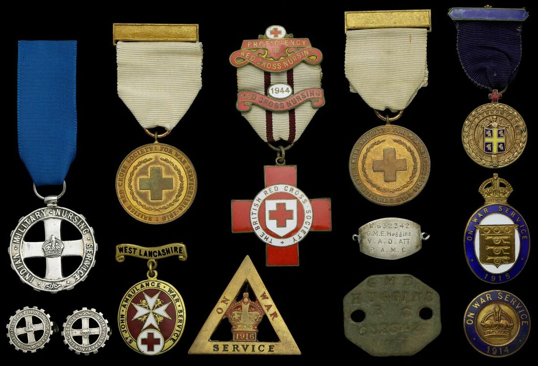 British Red Cross Society War Service Medal (2), unamed as issued; Indian Medical Nursing Service badge, unamed as issued, cast silver type; War Service nursing badges (4); Red Cross Stafford shoulder titles; British Red Cross epaulettes; British Red Cross Society buttons; County of Durham V.A.D. worker's Badge (1056 M. Woodmiss); British Red Cross Society Proficiency Badge, 1 clasp, Red Cross Nursing 1944 (43100 G. Huggins.), good very fine