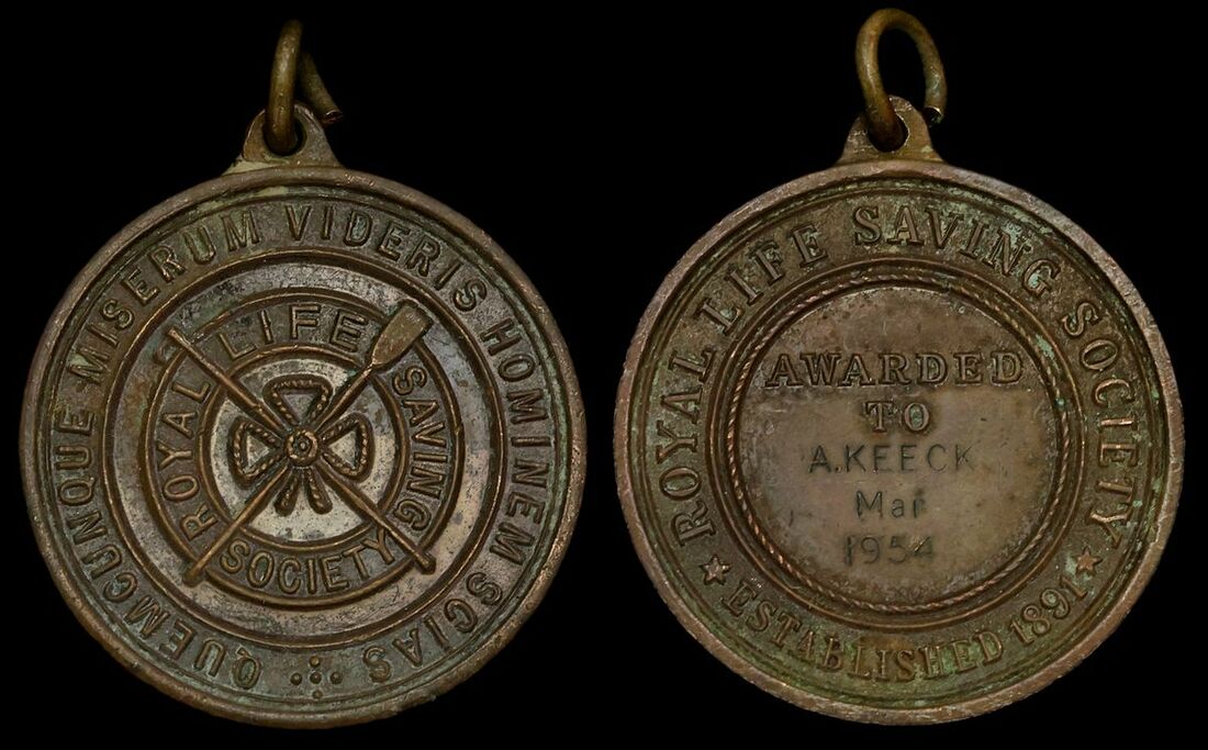Royal Life Saving Society bronze medal (A. Keeck Mar. 1954), overall somewhat worn, very fine