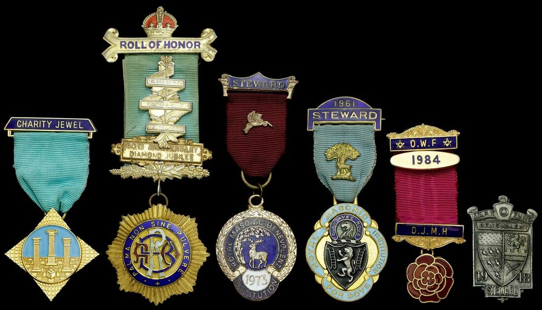 A collection of Masonic Jewels including charity Jewels, Steward's Jewels and a 60th Anniversary Diamond Jubilee Roll of Honour Jewel named to 'Bro. Owen. C. Sims. Magdalen Lodge No 7485 Exalted 5-5-83'. enamelled, the last hallmarked for London, overall good very fine (lot)