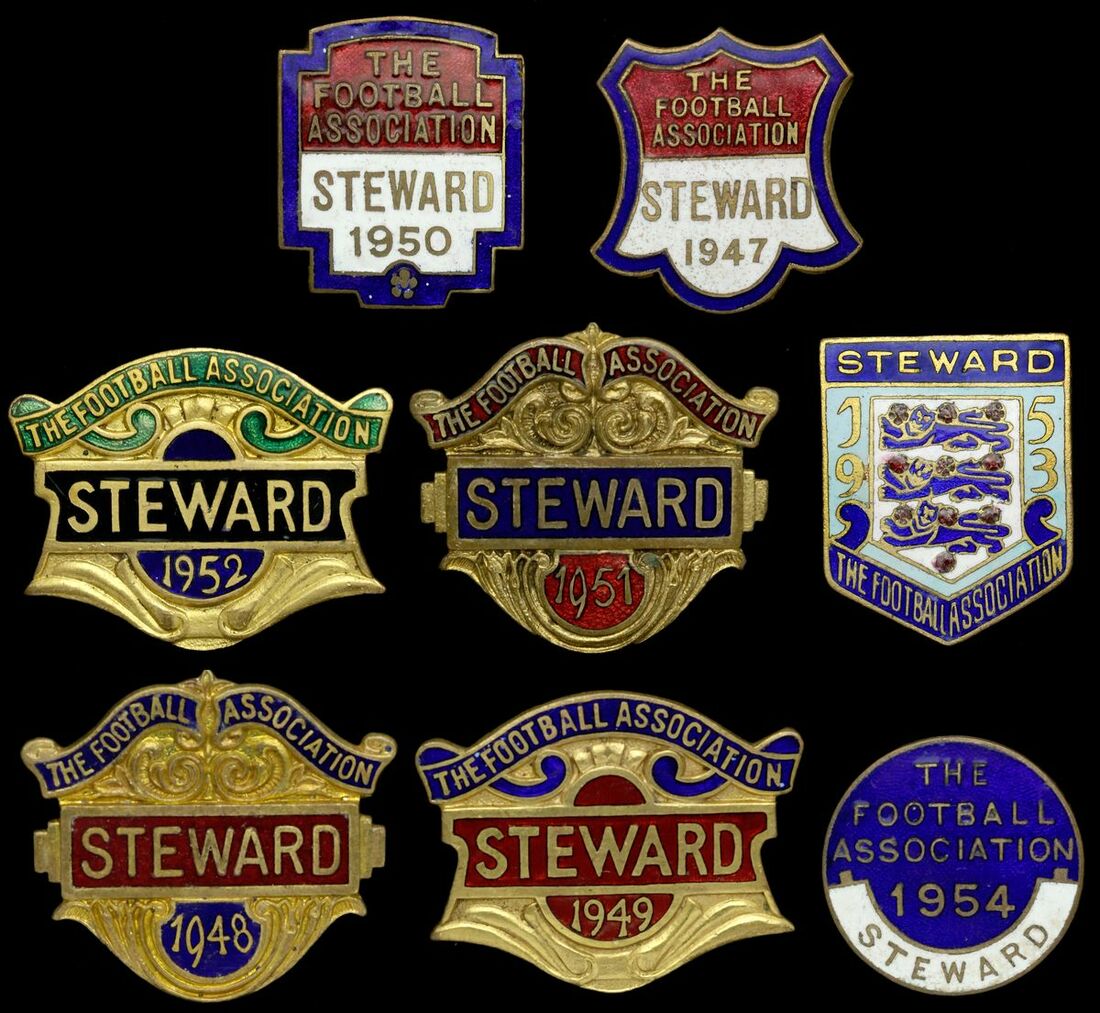 Football Association, a collection of enamelled Steward Badges for 1945, 1948, 1949, 1950, 1951, 1952, 1953 and 1954, complete with pin fittings to reverse where appropriate, very fine (Lot)