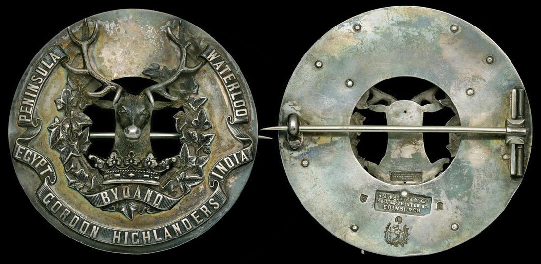 Gordon Highlanders Plaid Brooch, silver, hallmarks for 1892, by R. & H. B. Kirkwood, 66 & 68 Thistle St., Edinburgh, crudely engraved at 12 o'clock (C. J. Simpson Esq), a couple of edge bruises, otherwise lightly toned, good very fine