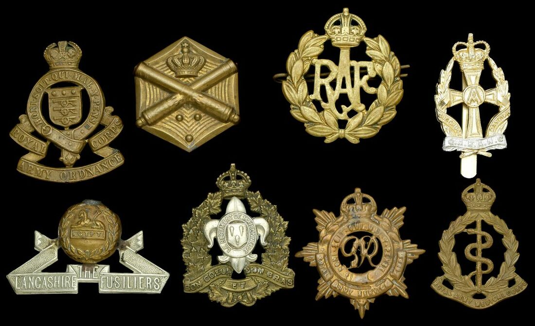 A collection of cap badges including R.A.F., Q.A.R.A.N.C., and the Lancashire Fusiliers, overall nearly very fine (lot)