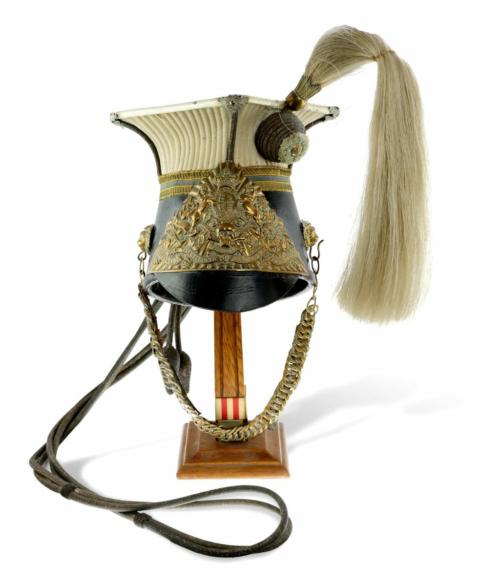 A late-Victorian era 17th (Duke of Cambridge's Own) Lancers headdress or Czapka, black leather skull with white cloth ribbed sides and white leather top, gilt bullion decoration and pom-pom, latter with correct 'deaths-head' button, brass fittings and horse-hair plume, front plate with battle honours up to 'South Africa 1879', interior lining present, marked with size in white lettering, waxed cotton sweatband in relic condition, brass curb-chain lining dry and distressed, complete gilded bullion cap-lines, together with a pair of brass spurs and leather attachments, also a wooden plinth for display, this with ribands attached for the Crimean, Indian Mutiny, South Africa and Queen's South Africa medal ribands attached to two sides, 305mm x 130mm, exterior black leather and white top somewhat crazed and white cloth with minor traces of moth damage, about good fine (3)