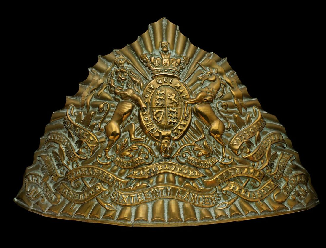 16th (The Queen’s) Lancers Other Ranks Full Dress Lance Cap or czapka Plate. A good quality die-stamped brass example, Royal Arms with Queen’s Crown, battle honours up to Sobraon and regimental title below, with two screw post fasteners, about very fine