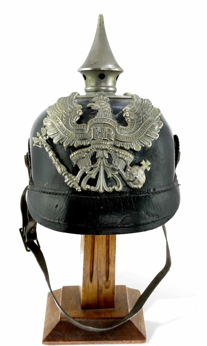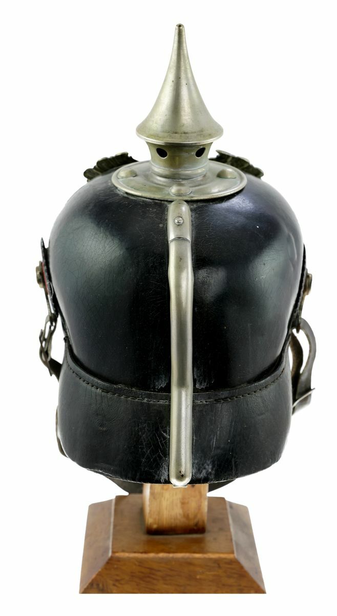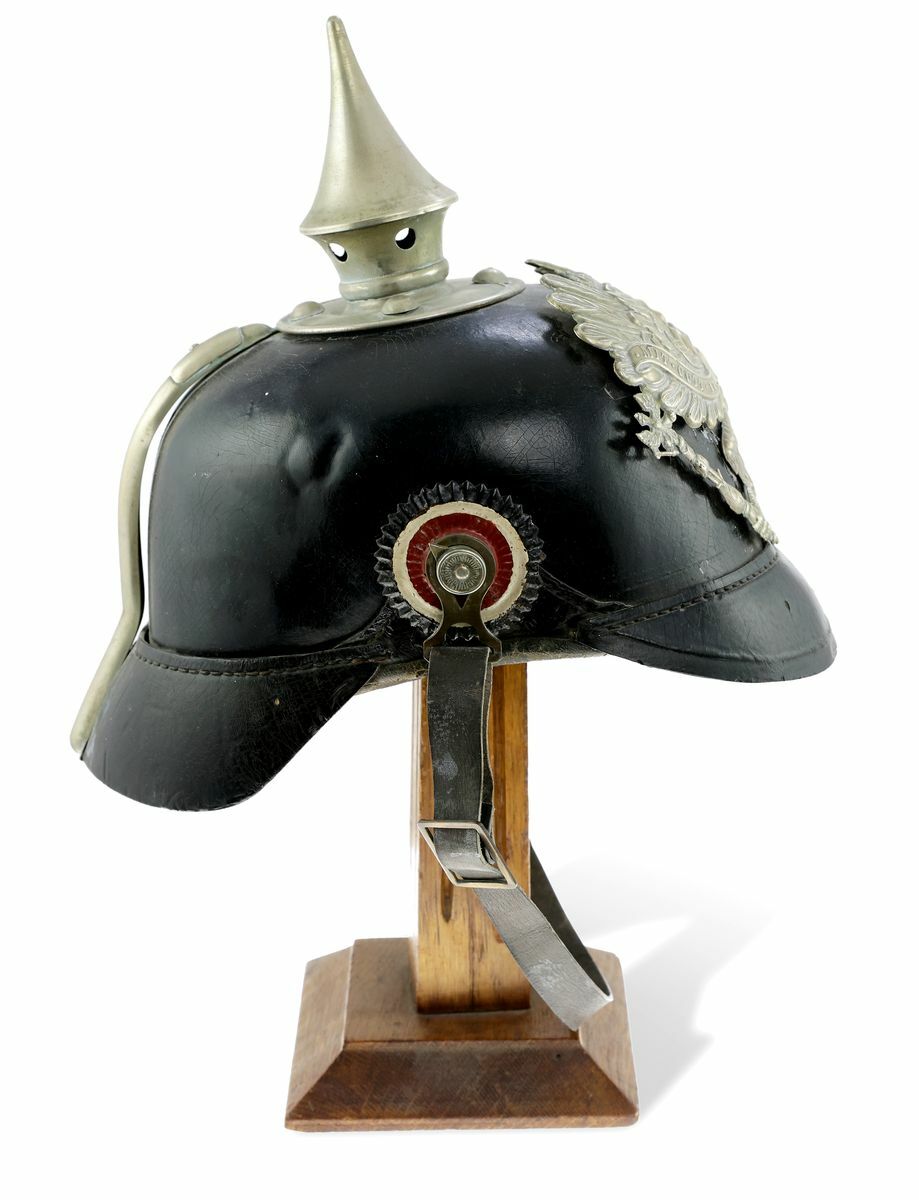 Imperial German Great War era Prussian Pickelhaube, black leather skull with silver-coloured steel fittings, red-white-black cockades to each side, brown leather chinstrap, leather lining, interior with several indistinct ink stamps, exterior leather with slight crazing and polish residue, with a wooden stand for display, square plinth, 230mm x 110mm, overall good fine (2)