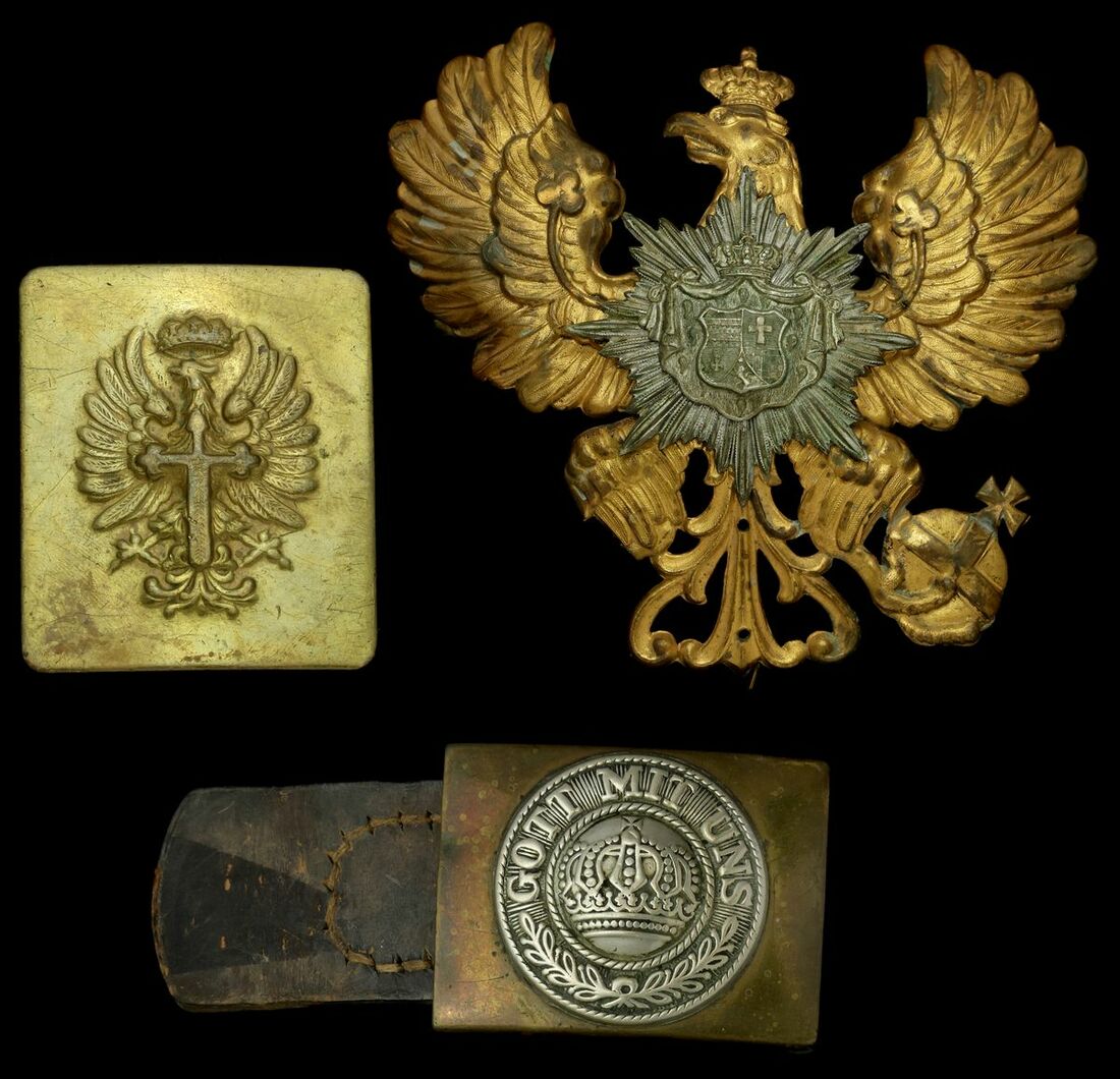 Imperial German belt buckle with leather tab; an Imperial German Picklehaube plate and a Spanish belt buckle the second incomplete and repaired, nearly very fine, sold as viewed (3)