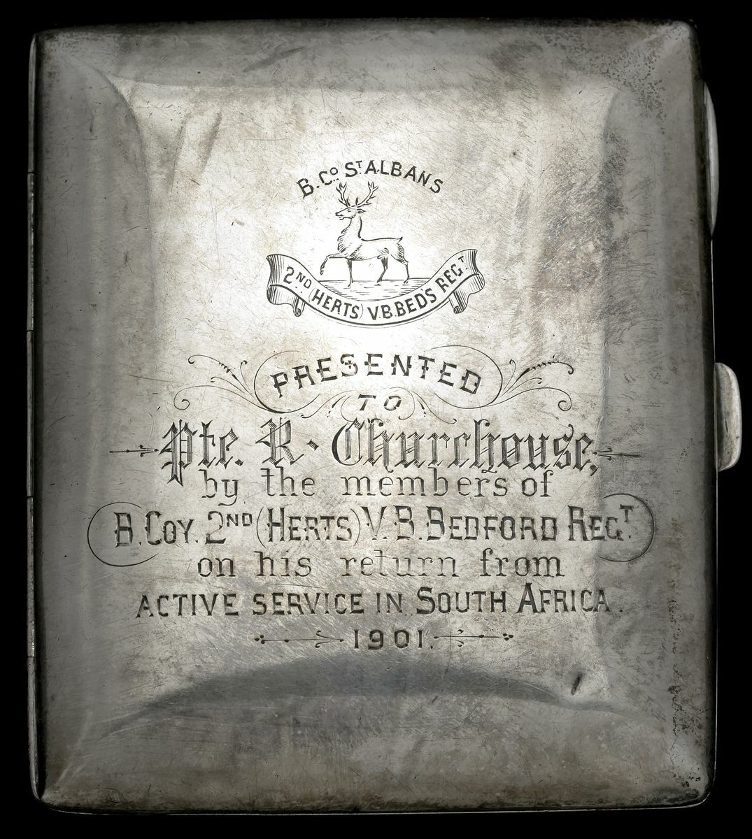 Cigarette Case, silver, hallmarks for Birmingham 1901, engraved on the outside of the case with Stag motif 'Presented to Pte. R. Churchouse by the members of B Coy 2nd (Herts) V.B. Bedford Regt on his return from Active Service in South Africa 1901', light wear and marks overall, otherwise very fine