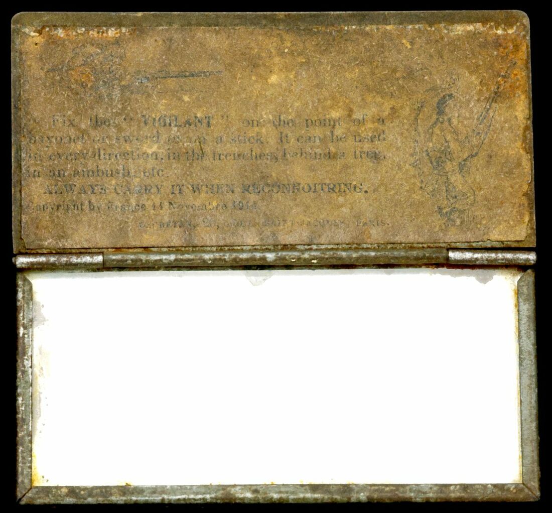 Great War "Vigilant" Trench mirror, with original paper label to the inside, Copyright by France 14 Novembre 1914, very fine and a rare survivor