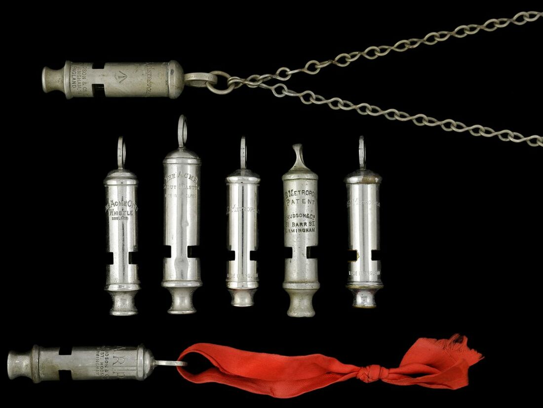 A collection of seven service whistles, several marked as government issue, overall very fine (7)