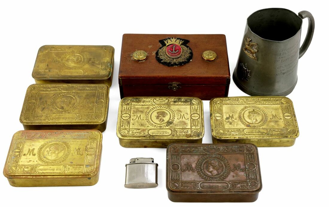 Assorted Militaria; Princess Mary 1914 Christmas Box (6), one containing an unopened packet of tobacco; pewter tankard presented to the W.Os and Staff Sgts and Sgts of the 1st Batt The Buffs by The Queen's Own Rifles of Canada, 1928, lighter with The Buffs connection and a scratchbuilt cigarette box with Merchant Navy insignia, nearly very fine (Lot)