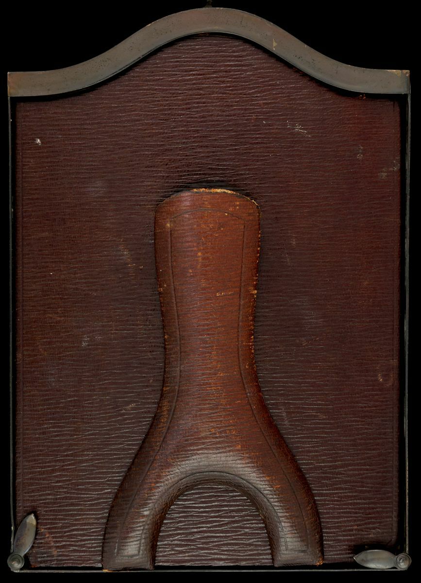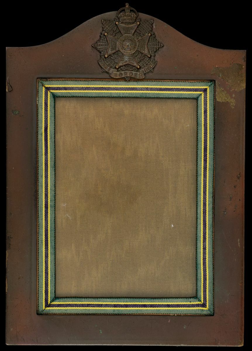 The Border Regiment, photo frame with bronzed finish and post-1902 Officer's cap Badge mounted at 12 o'clock, with leatherette backing and stand to reverse, suitable for a postcard size photograph, very fine