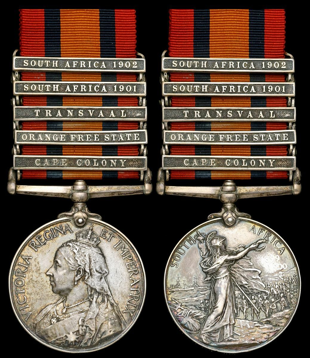 Queen's South Africa 1899-1902, 5 clasps, Cape Colony, Orange Free State, Transvaal, South Africa 1901, South Africa 1902 (7079 Cpl W. Bullbrooke, Vol. Coy N'rth'Mpt'n Regt), the 'E' of Bullbrooke appears to have been defaced and possibly wrongly named at the time and corrected by the recipient, some contact marks, otherwise very fine