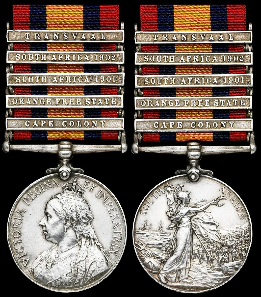 Queen's South Africa 1899-1902, 5 clasps, Cape Colony, Orange Free State, South Africa 1901, South Africa 1902, Transvaal (35576 Pte J. H. Leith. 75th Coy Imp: Yeo:), unofficial rivett to the last clasp, clasps mounted in this order, some light edge bruises, otherwise very fine