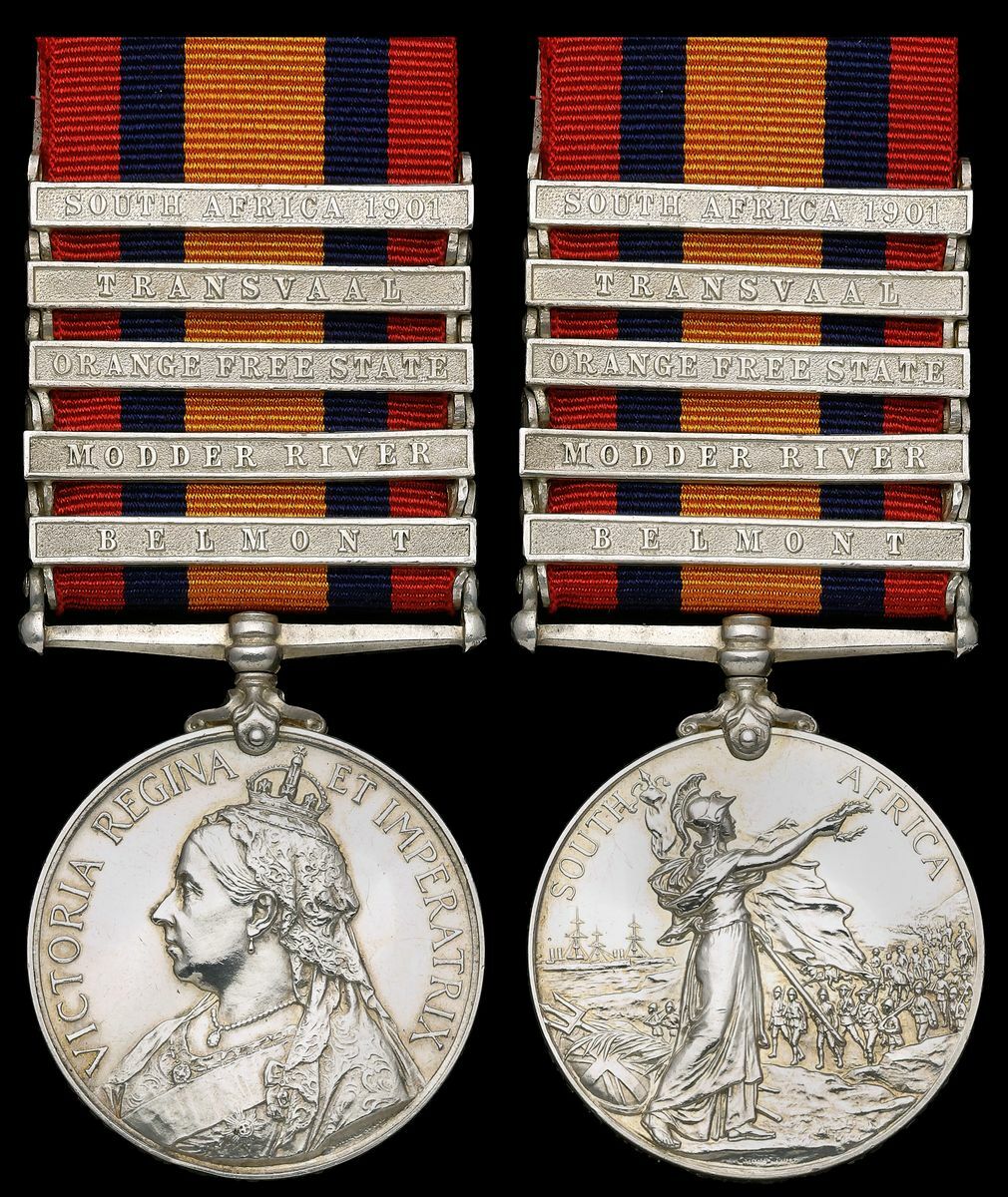 Queen's South Africa 1899-1902, 5 clasps, Belmont, Modder River, Orange Free State, Transvaal, South Africa 1901 (5228 Pte. M. Irving. Nth'ld Fus.), small edge bruise, otherwise good very fine