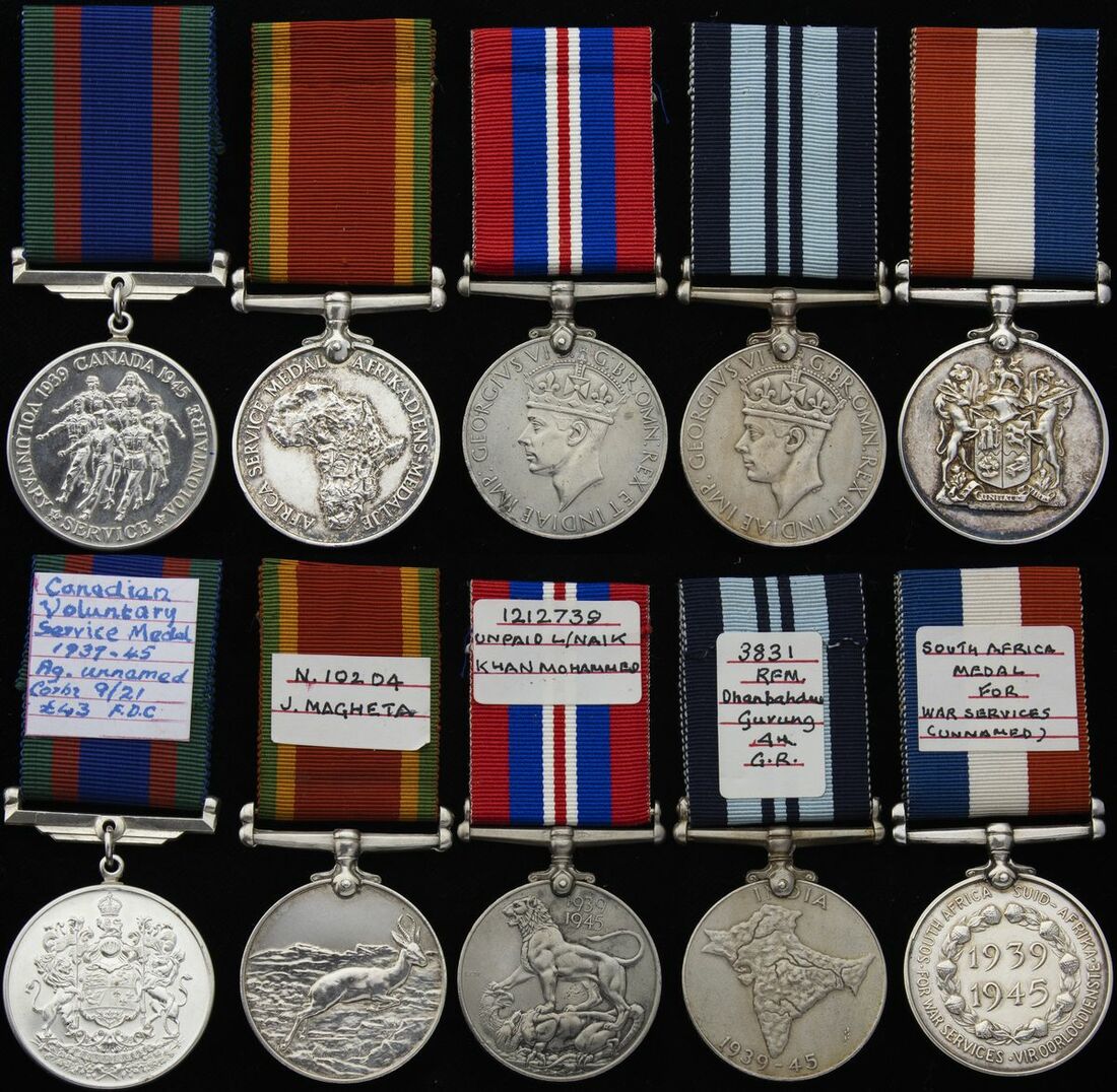 War Medal 1939-1945 (1212739 Ulnk Khan Mohd); India Service 1939-1945 (3831 Rfn. Dhanbahadur Gurung, 4 G.R.); Canada Service 1939-1945; South Africa Service 1939-1945; Africa Service (N.10204 J. Magheta), very fine (5)