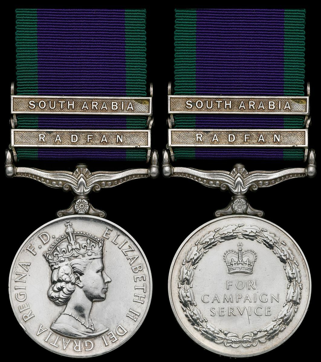 General Service 1962-2007, 2 clasps, Radfan, South Arabia (23950124 Pte. G. A. Pettit. 1 E. Anglian.), slight edge bruise, very fine and scarce combination to this unit