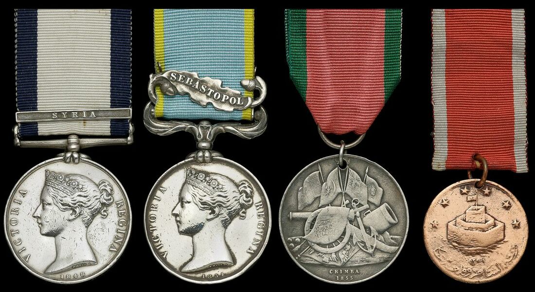 William Creek was born at Cambridge, and worked as a groom before enlisting on 29 September 1834. His first service was aboard H.M.S. Asia from 26 March 1836-10 April 1941, during which he saw action in the Syrian Campaign against the Egyptian ruler Mehemet Ali. Throughout his career Creek served with a number of vessels including Scout, Crocodile and Ganges. By the outbreak of the Crimean war he was with H.M.S. Queen and saw service in the Bombardment of Sebastopol with her. This was to be Creek's last posting and he was discharged on 15 April 1856; sold together with copied medal rolls and service papers.